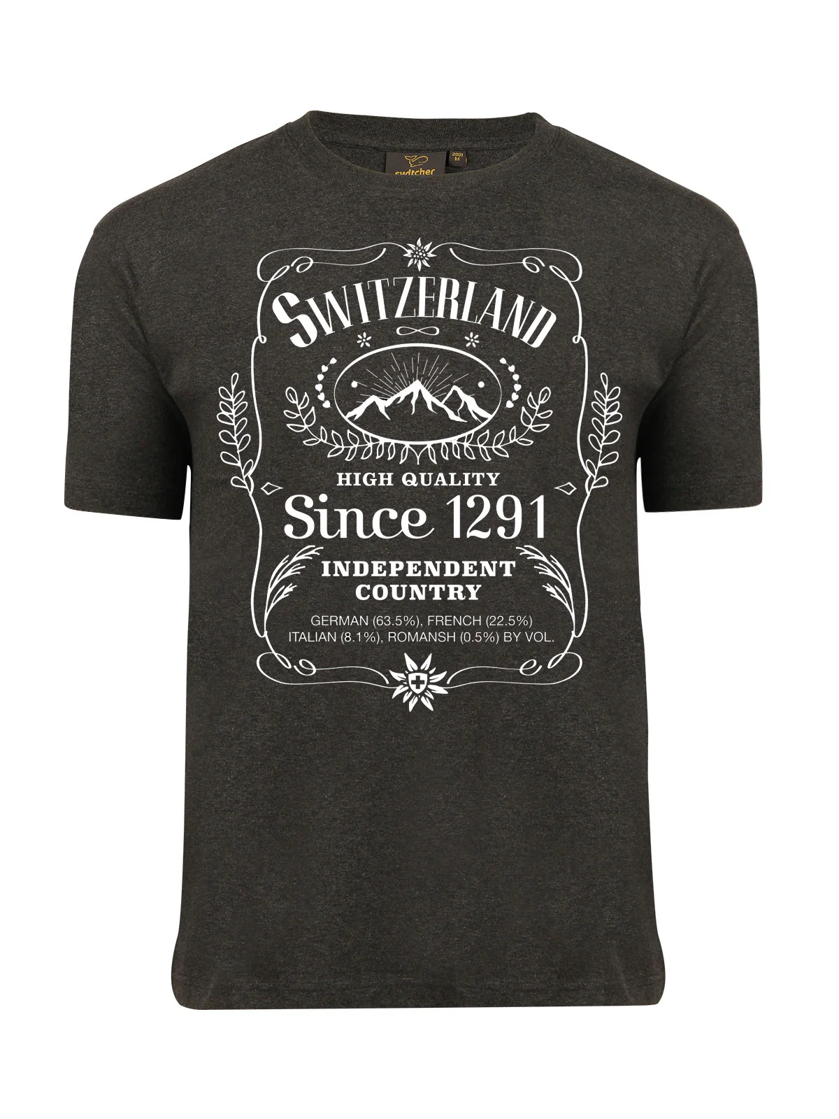 Herren T-Shirt Rundhals mit Textildruck. Nackenband. Doppelnaht an Arm und Bund, mit Seitennaht.