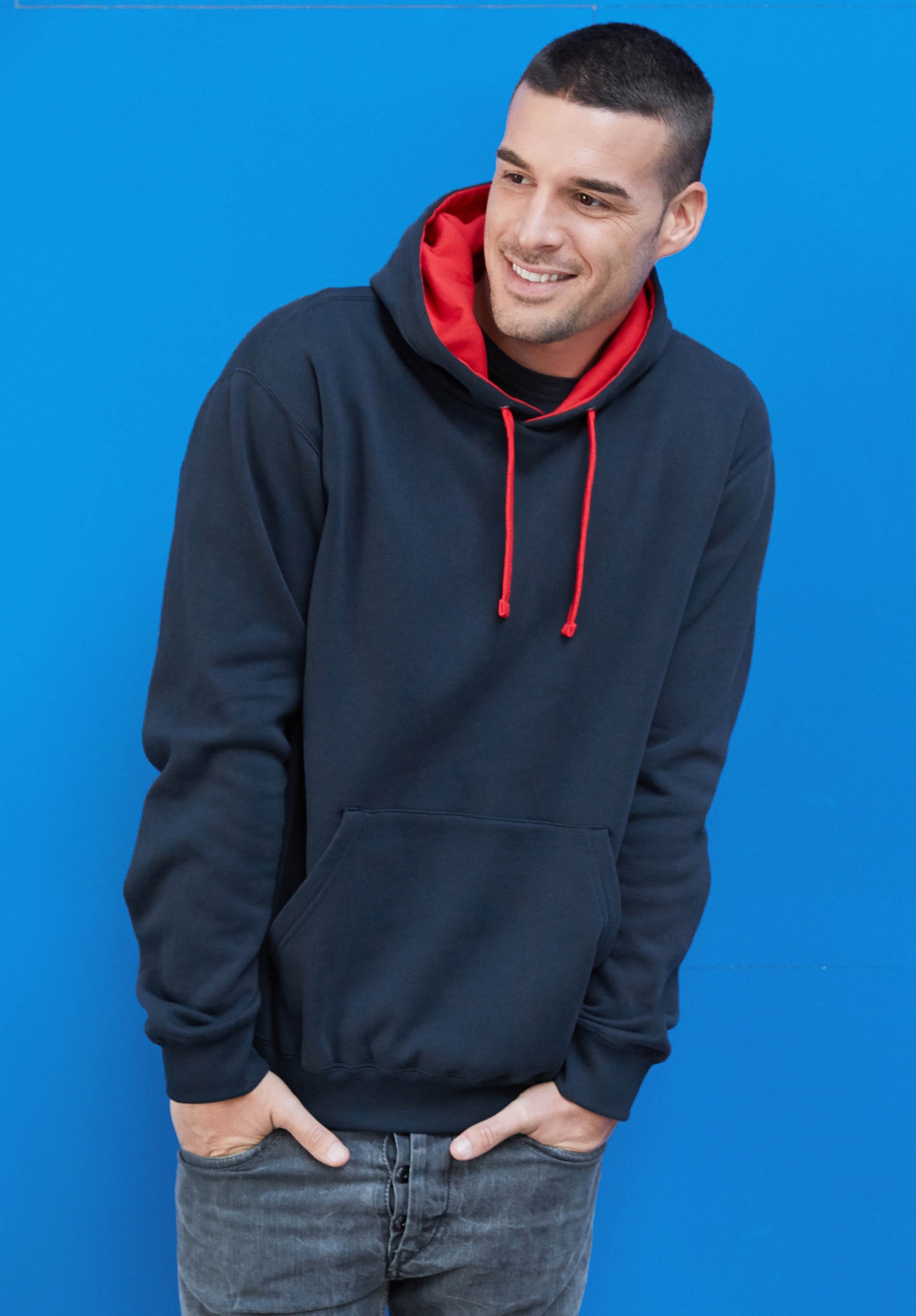 Kinder Kontrast Kapuzen Sweater   Material: 280g/m², 80% Baumwolle, 20% Polyester, aufgerauhte Oberfläche Kontrastfarbig gefütterte Kapuze, gerippte Ärmelbündchen und Bund, Kängurutasche mit Zugang für Kopfhörer Größen: 6/8 – 12/14