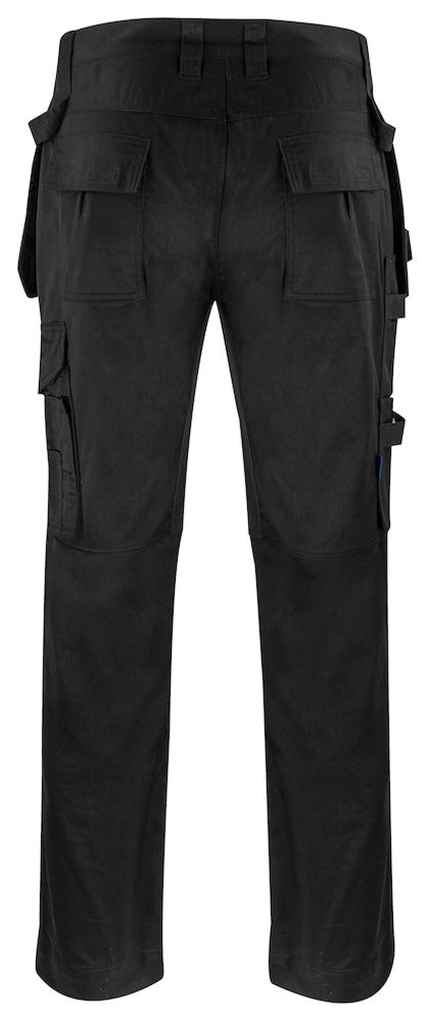 4-Wege Stretcheinsatz im Schritt für erhöhten Komfort. Holstertaschen, die in die Seitentaschen gesteckt werden können, auf der linken Seite Tasche mit einer zusätzlichen Tasche und auf der rechten Seite Schlaufen für Werkzeuge und offene Taschen. Gesässtaschen mit Patte und Klettverschluss. Metertasche und Tasche für Werkzeuge mit Messerknopf. Zwei Hammerschlaufen, eine auf jeder Seite. Reflektierende Paspelierung an der Aussenseite der Beine für bessere Sichtbarkeit. Vorgeformte Knie mit Innentaschen für Knieschützer, in zwei Höhenstufen verstellbar. Verstärkungen in Holstertaschen, Metertasche und über den Knien für erhöhte Haltbarkeit. Die Grössen C42-C64 können um 5 cm verlängert werden.