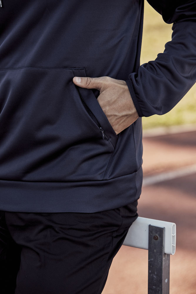 Kapuze mit Mesh gefüttert und Kordelzug, Känguru Fronttasche und eine versteckte Tasche mit Reissverschluss und Kopfhörerführung.