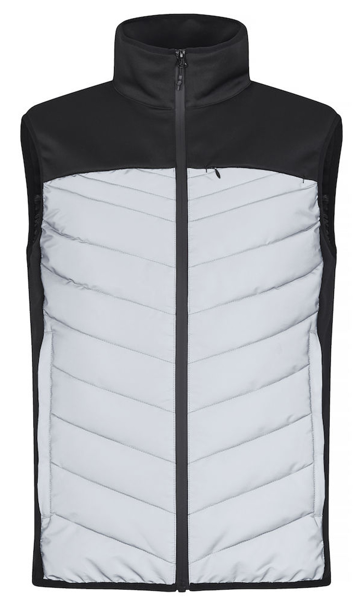 Eine modern geschnittene, leicht wattierte Weste mit grossen, reflektierenden Bereichen.