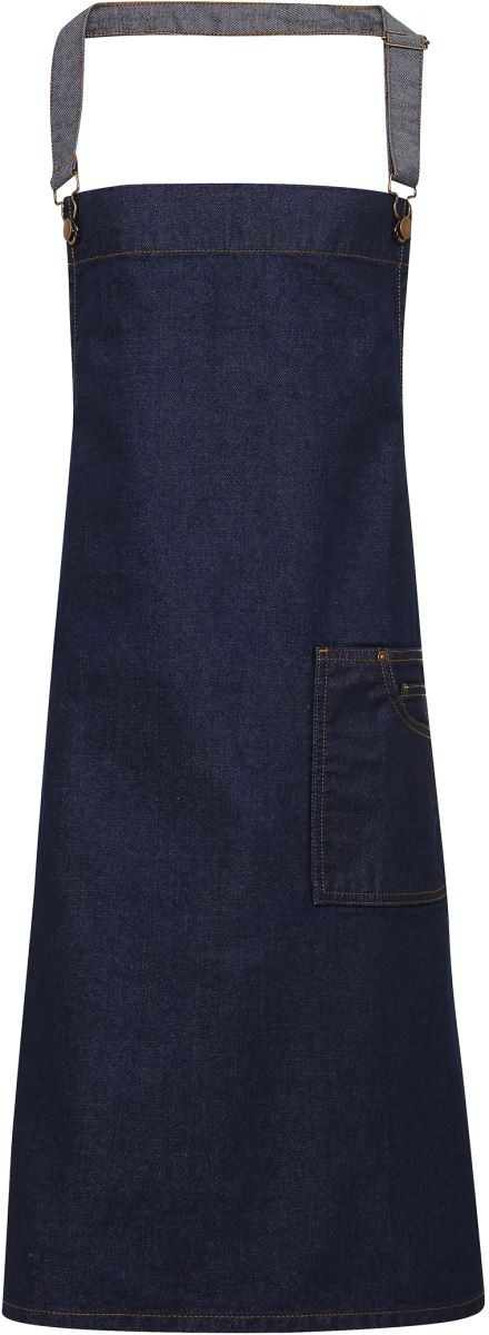Denim Latzschürze "Division" Material: 350g/m², 100% Baumwoll Denim mit Acrylbeschichtung Gewachste Optik, wasserabweisende Eigenschaften, 100cm lange Bindebänder aus Kunstleder, verstellbares Nackenband mit Metallschnalle, kontrastfarbene Jeans-Steppnähte, aufgesetzte Tasche und Tuchhalter, waschbar bei 40°, Breite: 72cm, Länge: 86cm Größen: onesize