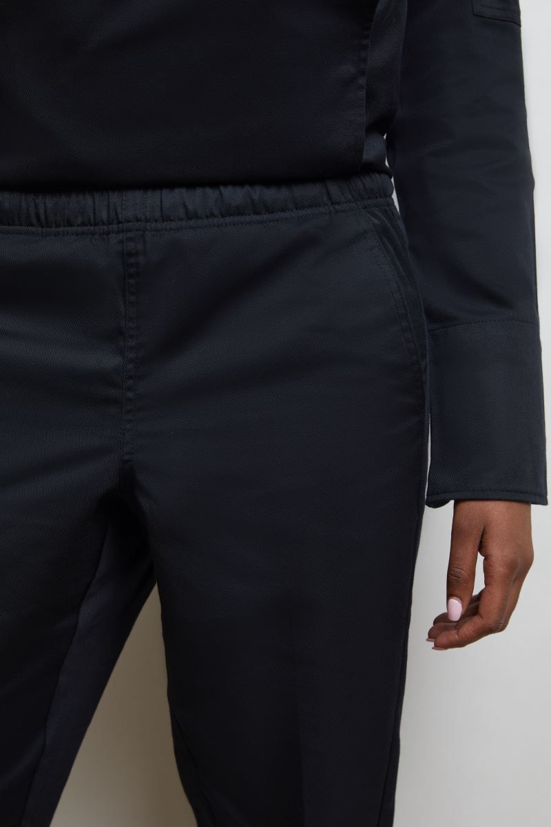 Unisex, elastischer Bund mit flachem Kordelzug, an Beinen schmal geschnitten, aufgesetzte Gesässtasche, 2 seitliche Einschubtaschen, TearAway Label, neutrales Grössenlabel, Länge: 83cm, 60° waschbar