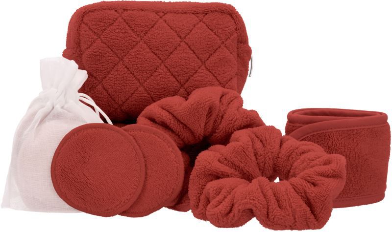 Set enthält 2 Scrunchies, 1 Spa Stirnband und 7 Reinigungspads, Tasche mit Rautenmuster und Reissverschluss, samtig weiches Material, besonders gute Saugfähigkeit, Scrunchies verwendbar als Haargummi und Gesichtswasch-Armband, Masse: Kosmetiktasche (10x15x7cm), Stirnband (63x8cm), Scrunchies (14x14cm), Reinigungspads (8x8cm), 60° waschbar, Produzent empfiehlt Waschen bei 20-40° zur Schonung der Umwelt