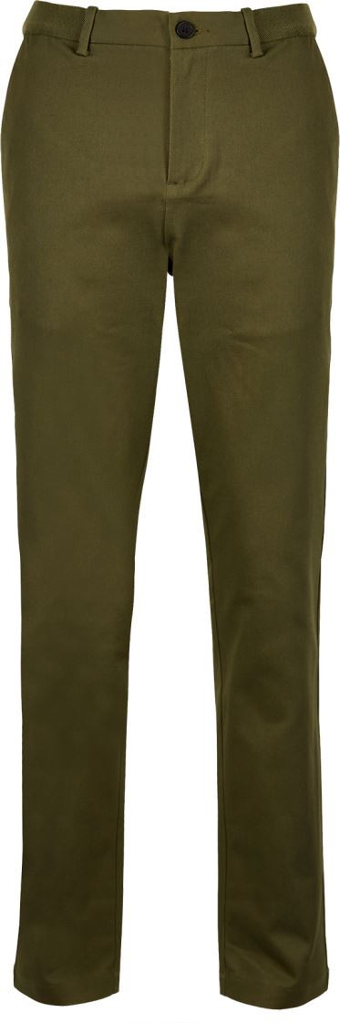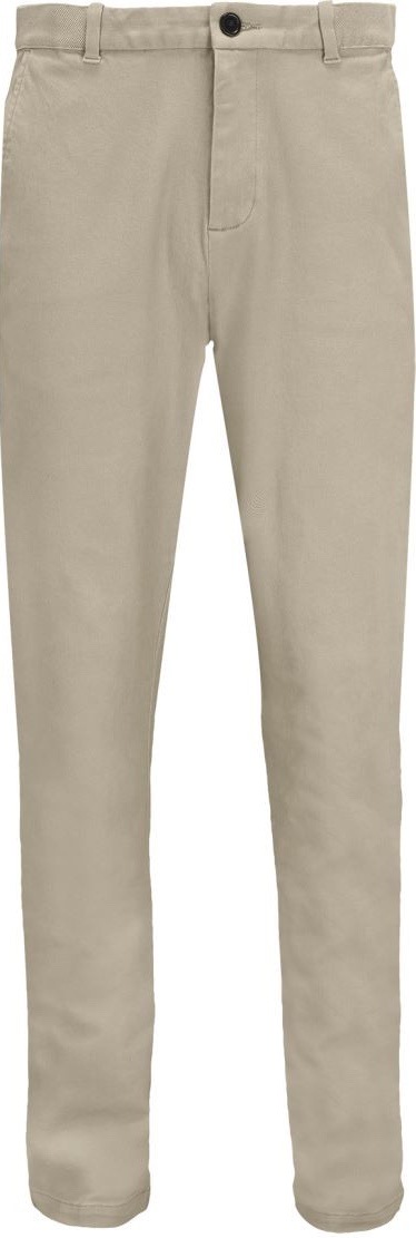 Elastischer Bund mit Gürtelschlaufen, Reissverschluss und Knopf, 2 Gesässtaschen mit Paspel, schräge Eingrifftaschen vorne, französische Grössen: bitte Umrechnung entsprechend Masstabelle, 30° waschbar