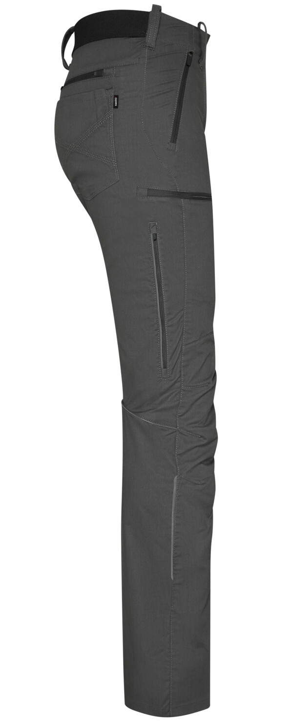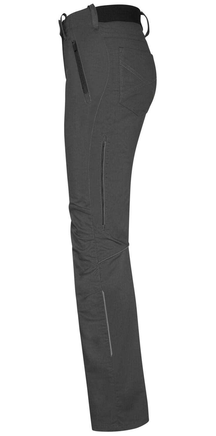 Sicherheitsknopf, Reißverschluss, Gürtelschlaufen, eingenähte Reflexbänder und ergonomisch vorgeformte Passform. Zwei Einschubtaschen mit Reißverschluss und Gesäßtaschen mit Stickerei und Reißverschlusstasche rechts. Oberschenkeltasche am rechten Bein und zwei Beinbelüftungen, jeweils mit Reißverschluss und Reißverschlussgarage. Alle Reißverschlüsse von YKK®. Besonders strapazierfähiger Materialmix aus Baumwolle, GRS-zertifiziertem, recyceltem Polyester und Elastolefin.
