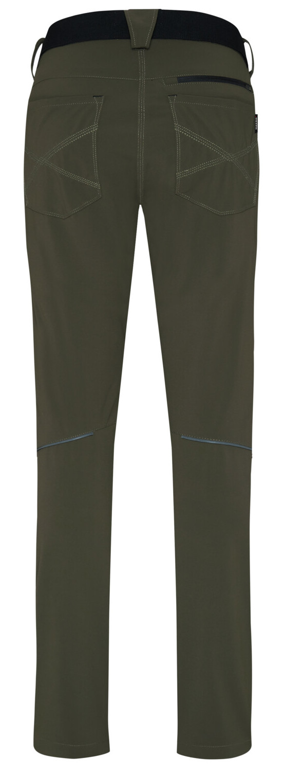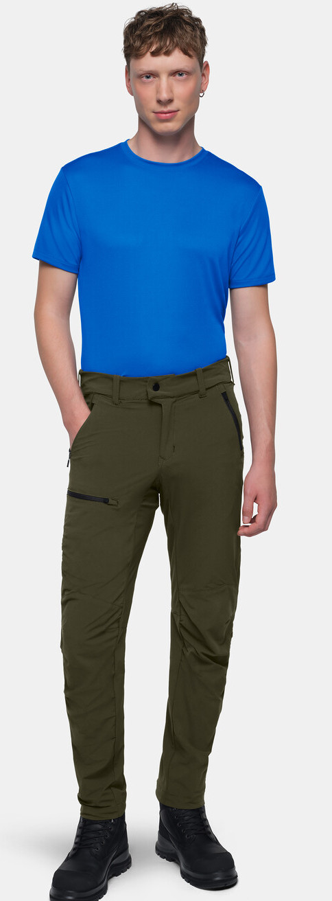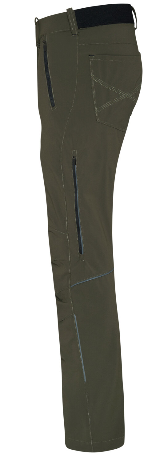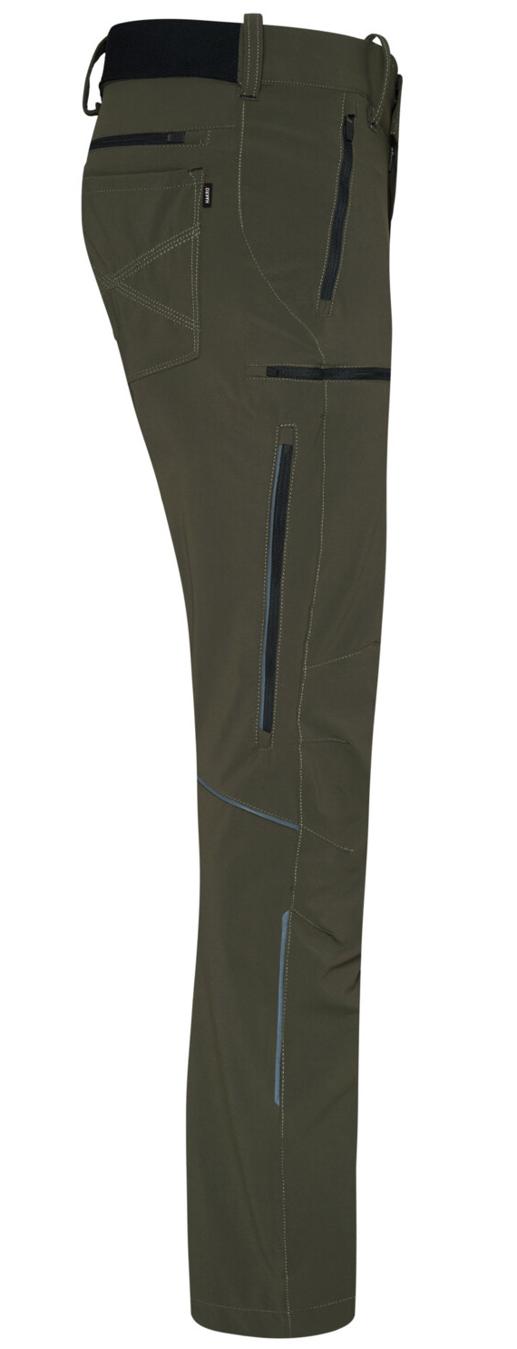 Sicherheitsknopf, Reißverschluss, Gürtelschlaufen, eingenähte Reflexbänder und ergonomisch vorgeformte Passform. Zwei Einschubtaschen mit Reißverschluss, zwei Gesäßtaschen mit Stickerei und Reißverschlusstasche rechts, eine Oberschenkeltasche am rechten Bein und zwei Belüftungen, jeweils mit Reißverschluss und Reißverschlussgarage. Alle Reißverschlüsse von YKK®. Elastisches, strapazierfähiges und atmungsaktives 4-Wege-Stretchmaterial.