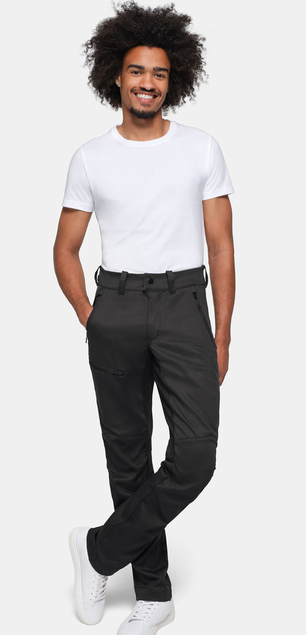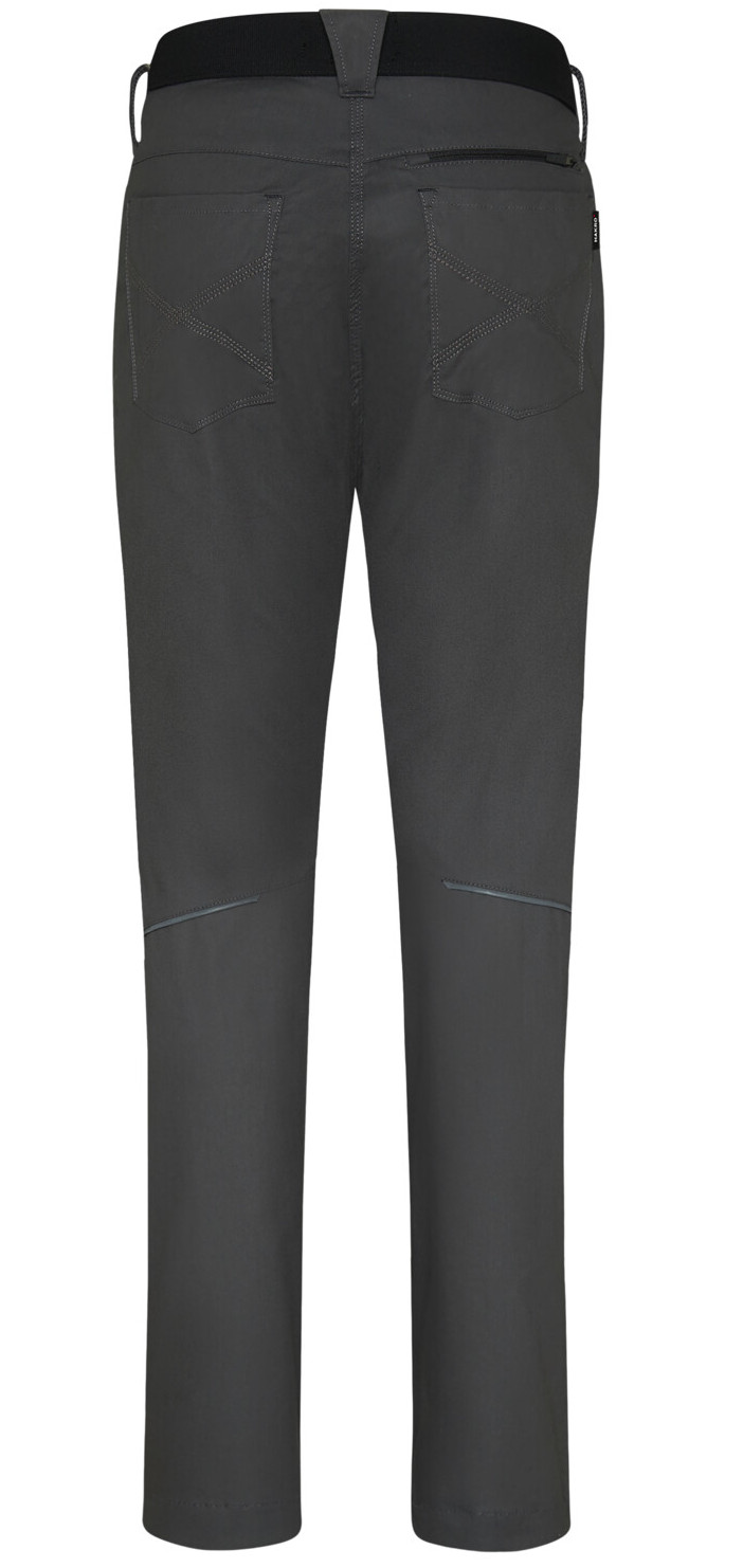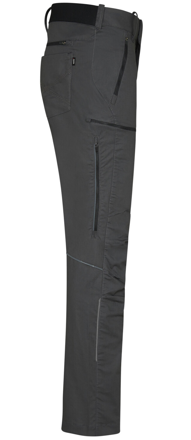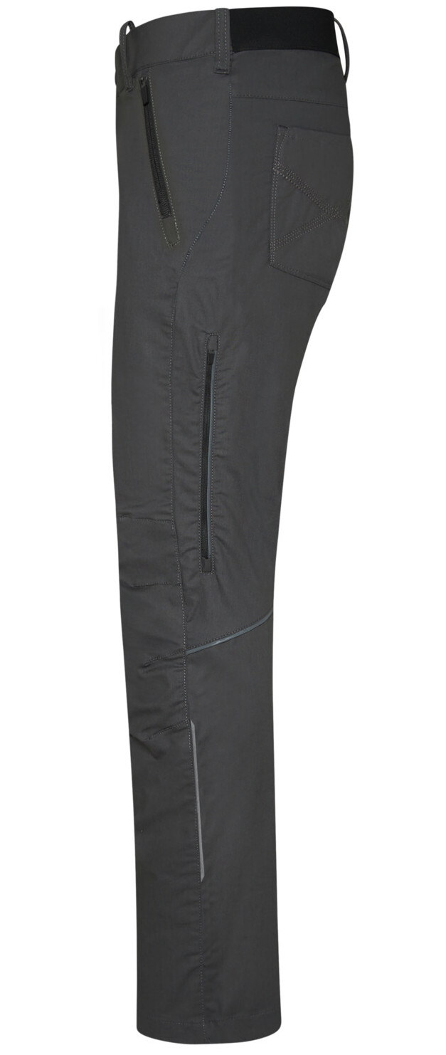 Sicherheitsknopf, Reißverschluss, Gürtelschlaufen, eingenähte Reflexbänder und ergonomisch vorgeformte Passform. Zwei Einschubtaschen und Gesäßtaschen mit Stickerei und Reißverschlusstasche rechts. Oberschenkeltasche am rechten Bein und zwei Beinbelüftungen, jeweils mit Reißverschluss und Reißverschlussgarage. Alle Reißverschlüsse von YKK®. Besonders strapazierfähiger Materialmix aus Baumwolle, GRS-zertifiziertem, recyceltem Polyester und Elastolefin.