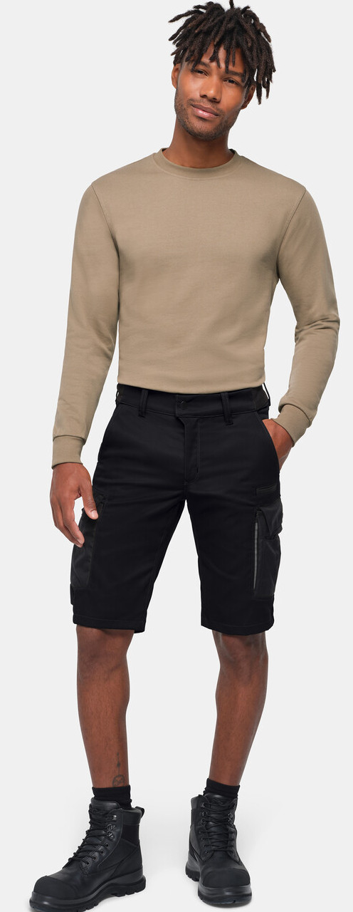 Sicherheitsknopf, Reißverschluss, Gürtelschlaufen, eingenähte Reflexbänder und ergonomisch vorgeformte Passform. Zwei Einschubtaschen, rechts mit zusätzlicher Sicherheits-Reißverschlusstasche. Zwei Gesäßtaschen mit Stickerei, rechts mit Patte und Klettverschluss. Zwei Cargotaschen mit multifunktionellen Unterteilungen, verschließbar mit Patten und Reißverschlüssen. Aufgesetzte Zollstocktasche auf der rechten Seite. Alle aufgesetzten Taschen aus CORDURA® und alle Reißverschlüsse von YKK®. Besonders strapazierfähiger Materialmix aus Baumwolle, GRS-zertifiziertem, recyceltem Polyester und Elasthan.