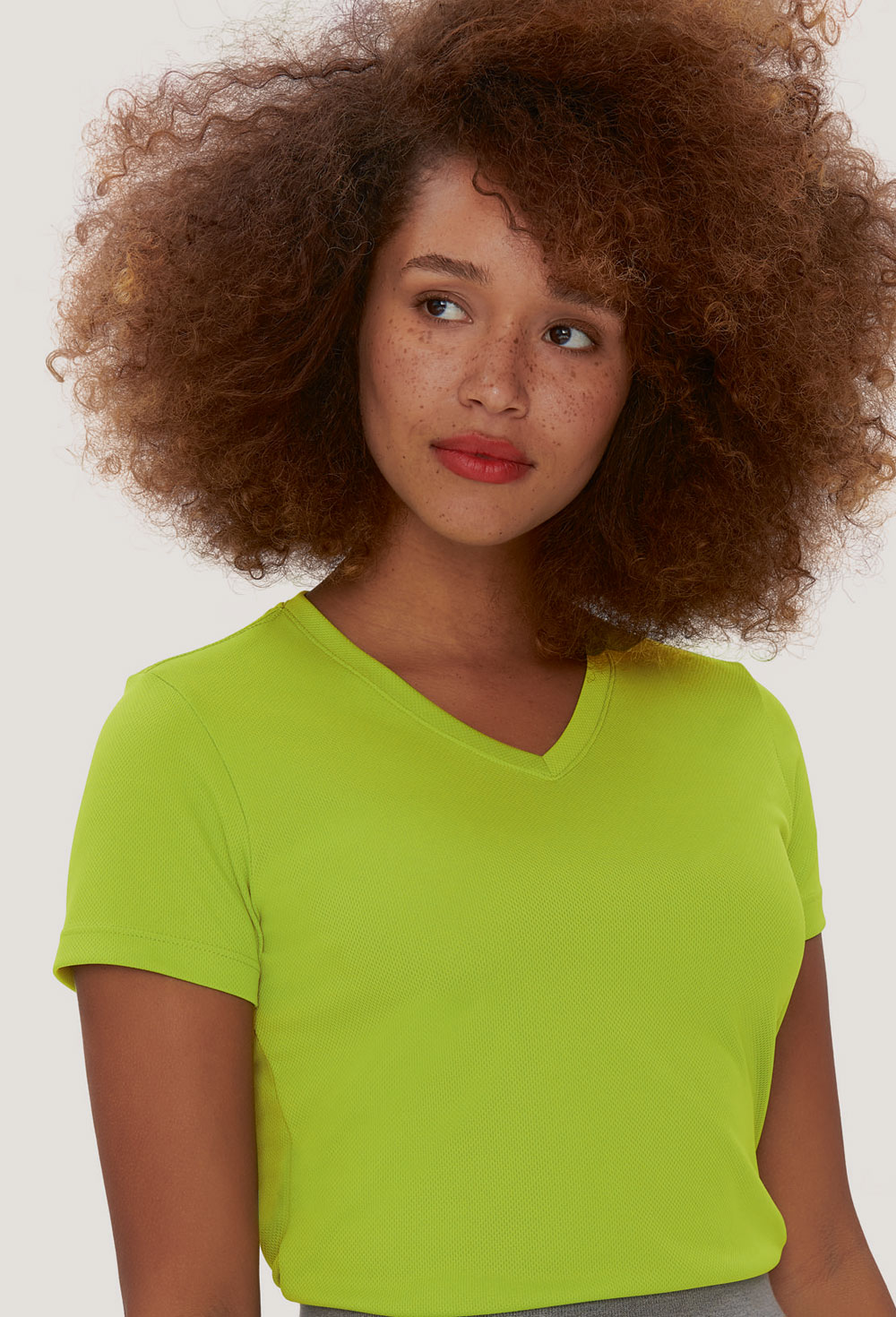 Funktionelles Sport T-Shirt für Damen mit feminin geschnittenem V-Ausschnitt, verlängertem, abgerundetem Rückenteil und Nackenband. Hergestellt aus COOLMAX® EXTREME - einer Funktionsfaser für extreme Belastungen. Temperaturregulierend durch schnellen Transport der Feuchtigkeit an die Textilaußenseite, wo sie sofort verdunsten kann; atmungsaktiv, pflegeleicht und schnell trocknend. Gedrucktes HAKRO-Necklabel für höchsten Tragekomfort und gewebtes HAKRO-Flaglabel an der linken Seitennaht.