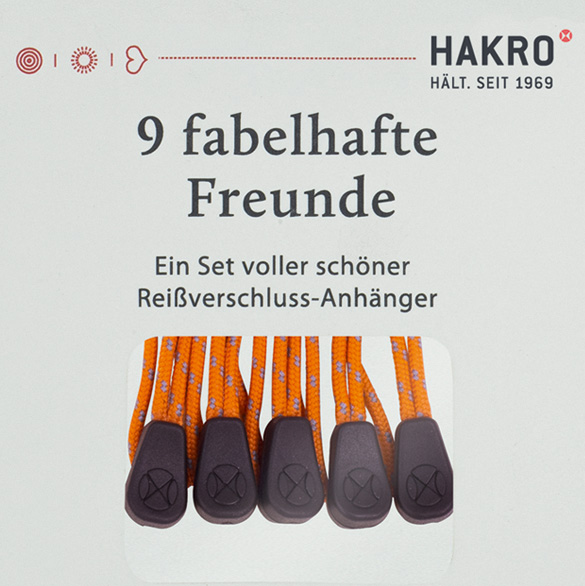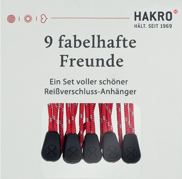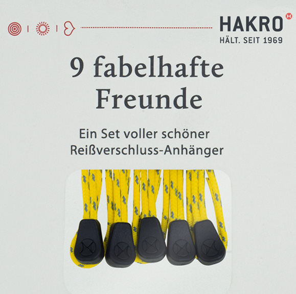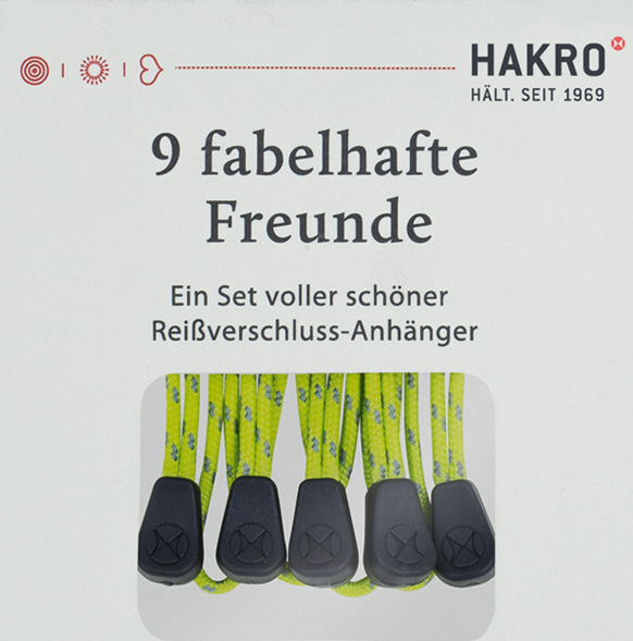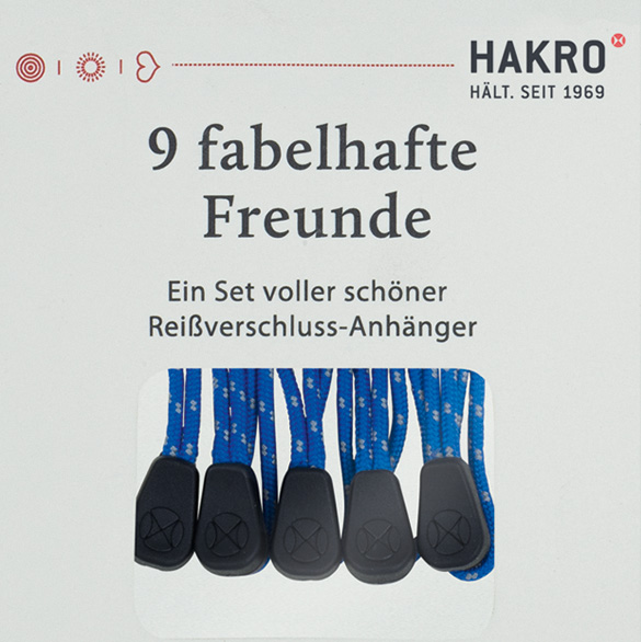 Set mit 9 Reißverschlussanhängern. Hergestellt aus Polyester mit beidseitig geprägtem HAKRO-Dot. Einfach die mitgelieferten Reißverschlussanhänger gegen die fabelhaften Freunde in Ihrer Wunschfarbe austauschen und die Jacke oder Weste auf die eigene Corporate Identity abstimmen.