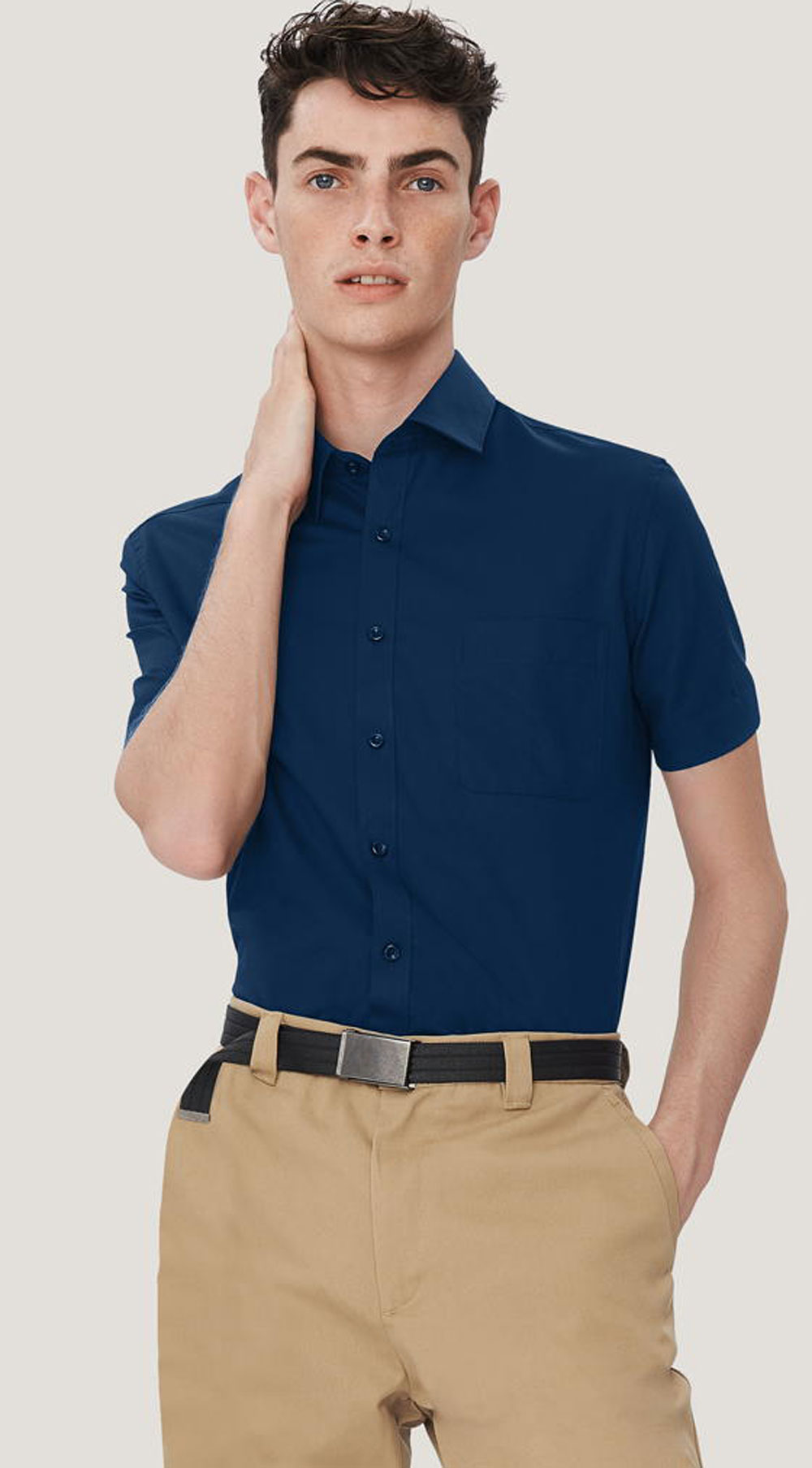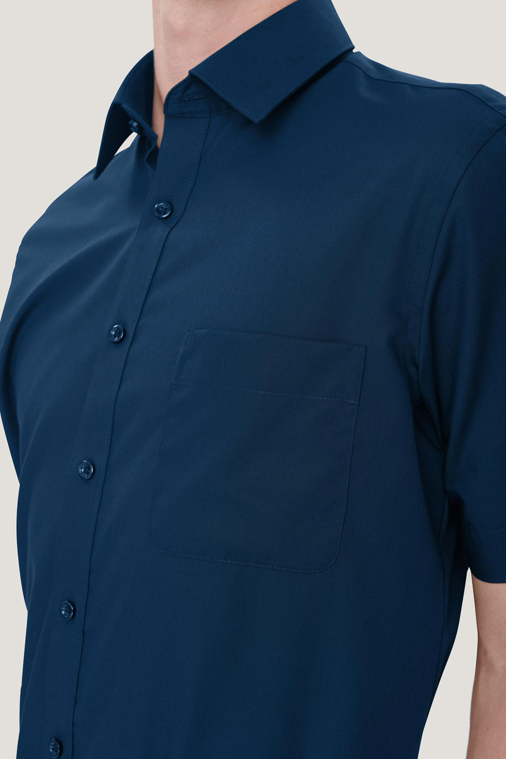 Kurzärmeliges Hemd mit Kent-Kragen, aufgesetzter Brusttasche, leicht gerundetem Saum, modischer Paspel aus dunkelblauem Satin an der inneren Kragennaht, hochwertig verarbeiteter Knopfleiste, doppelter Schulterpasse, 4-Loch-Knöpfen - über Kreuz vernäht und doppelt verknotet für extrafesten Halt -, Ersatzknöpfen und eingearbeiteten Kragenstäbchen für einen perfekt sitzenden Hemdkragen. Hergestellt aus formstabilem, strapazierfähigem und bügelfreiem Baumwoll-Popeline. Gewebtes HAKRO-Necklabel aus hochwertigem Kettsatin mit weichen, ultraschallgeschnittenen Bandkanten für höchsten Tragekomfort.