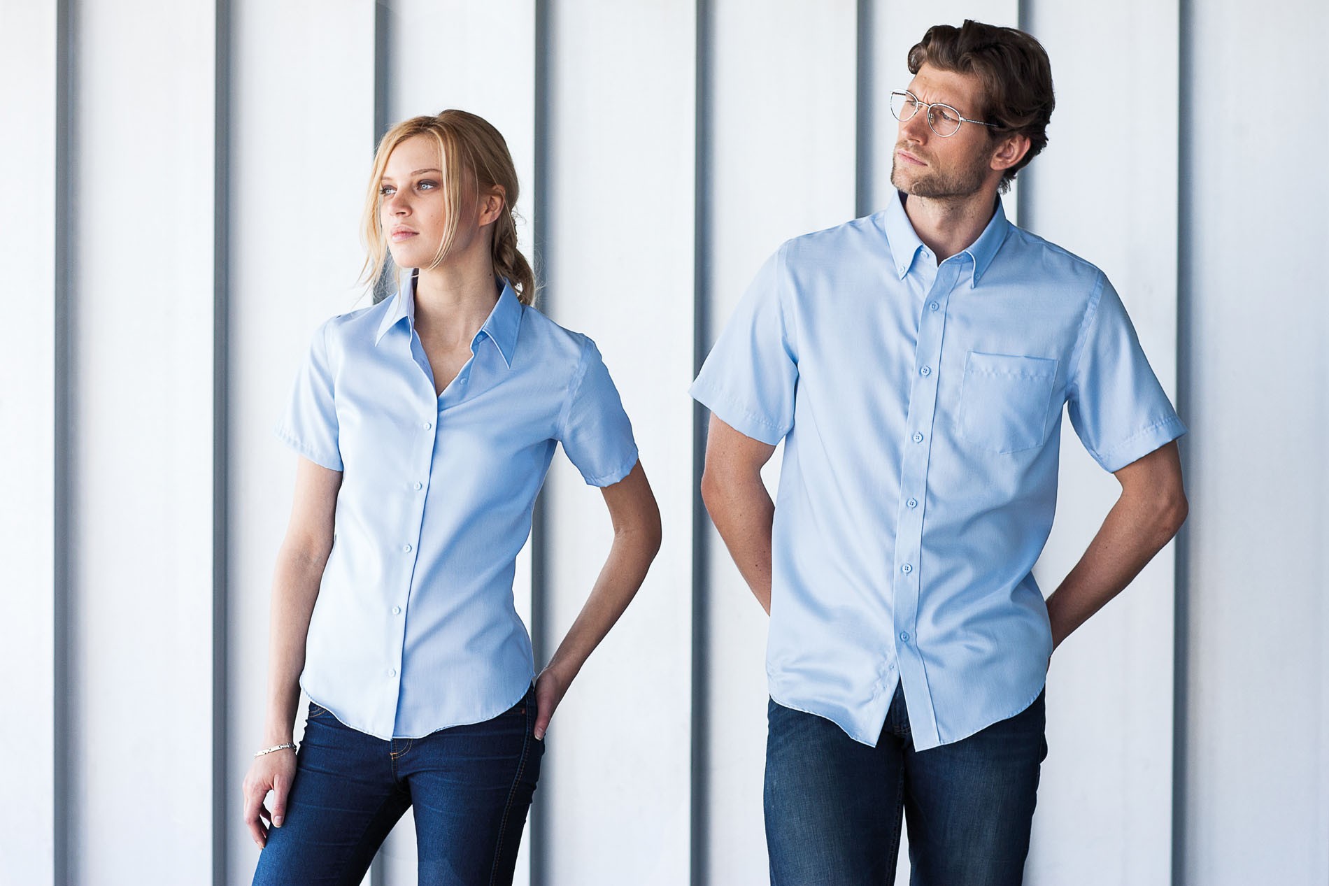 Verstärkter Button-Down-Kragen, eingesäumte Knopfleiste mit farblich abgestimmten Knöpfen, 2 Ersatzknöpfe, aufgesetzte Brusttasche links, abgerundeter Saum, rückwärtige Schulterpasse mit 2 an den Seiten eingelegten Falten, bügelfrei