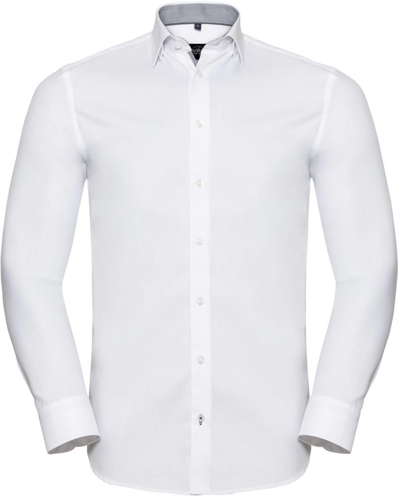 Taillierter Schnitt, Under-Button-Down Kragen, Kontrast-Paspel an Krageninnenseite und Manschette, Kontrasteinfassung an unterer Knopfleiste, kontrastfarbene Knopfloch an Manschette und unterstem Knopfloch, abgerundete mit 2 Knöpfen verstellbare Manschetten, abgerundeter Saum, Abnäher hinten, Easy Care, trocknergeeignet
