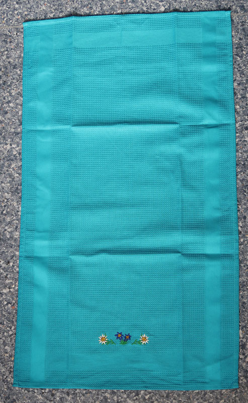 Besticktes Küchentuch in 2 Farben erhältlich. Das Stickerei ist ein mehrfarbiges Motiv von Blumen (Edelweiss und Enzian).