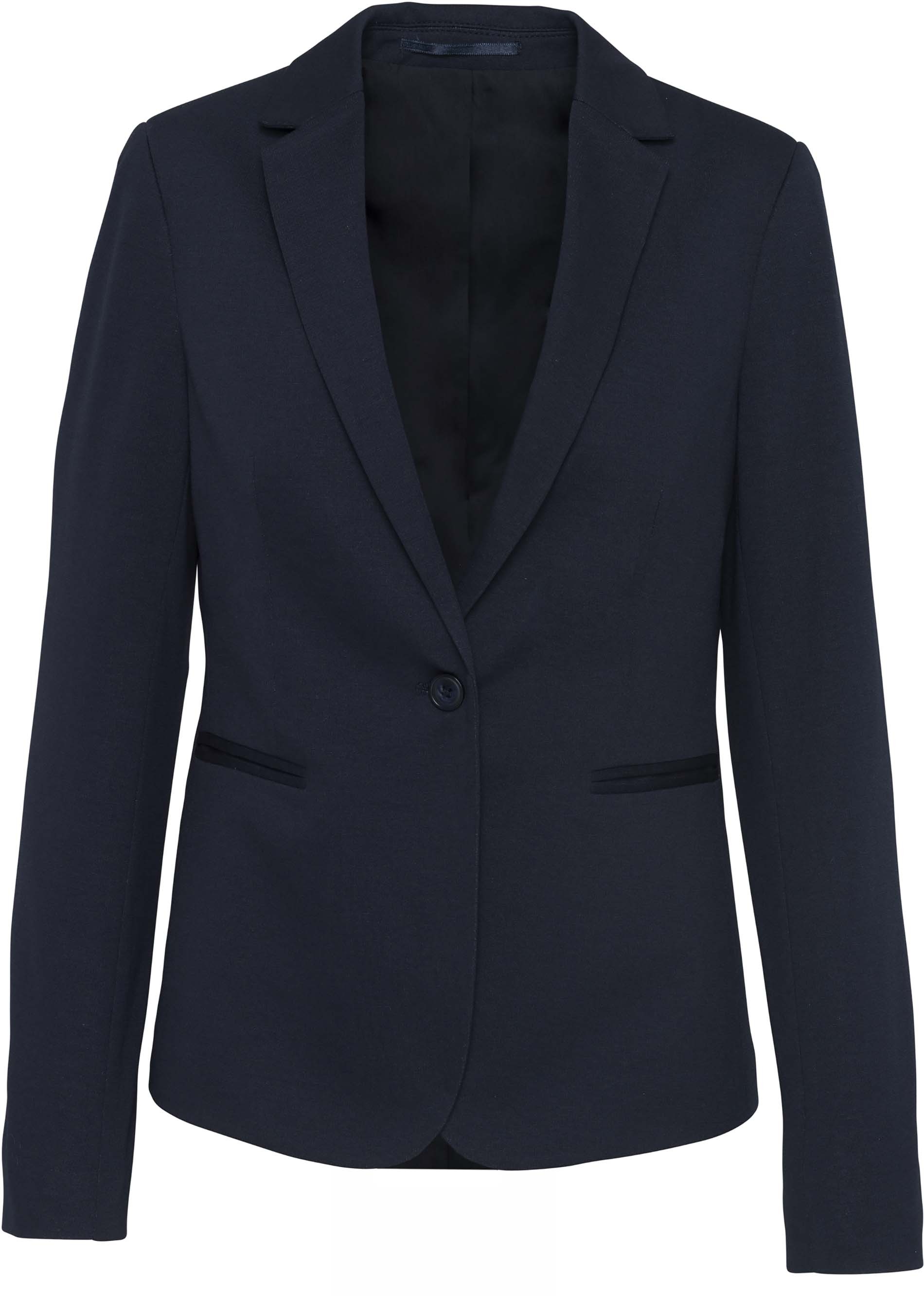 Jacke mit 1 Knopf, 2 Fronttaschen mit Paspel, 1 Innentasche mit Knopf, Manschetten mit 3 Knöpfen davon einer mit kontrastfarbigem Knopfloch, 1 Schlitz am Rücken, kontrastfarbige Innenseite