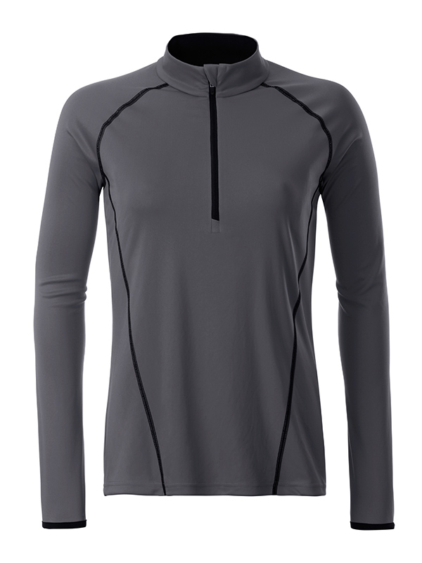 Atmungsaktiv und feuchtigkeitsregulierend, Schnell trocknend, leicht und komfortabel, Raglanärmel, Stehkragen, Kontrastfarbige Flatlocknähte im Vorder- und Rückenteil, Kragen innen und Armabschluss in Kontrastfarbe, Reißverschluss mit Kinnschutz, leicht tailliert