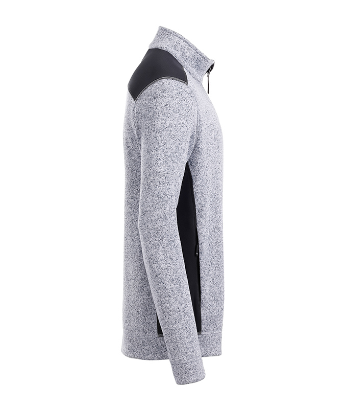 Weiches, wärmendes, pflegeleichtes Material in Melangeoptik, Außenseite Strickoptik, Innenseite flauschig weich angeraut, elastische Softshelleinsätze an Seite, Schulter und Ärmel, 2 Seitentaschen mit verdecktem Reißverschluss, Stehkragen, durchgehend unterlegter Reißverschluss mit Kinnschutz, JN861: leicht tailliert