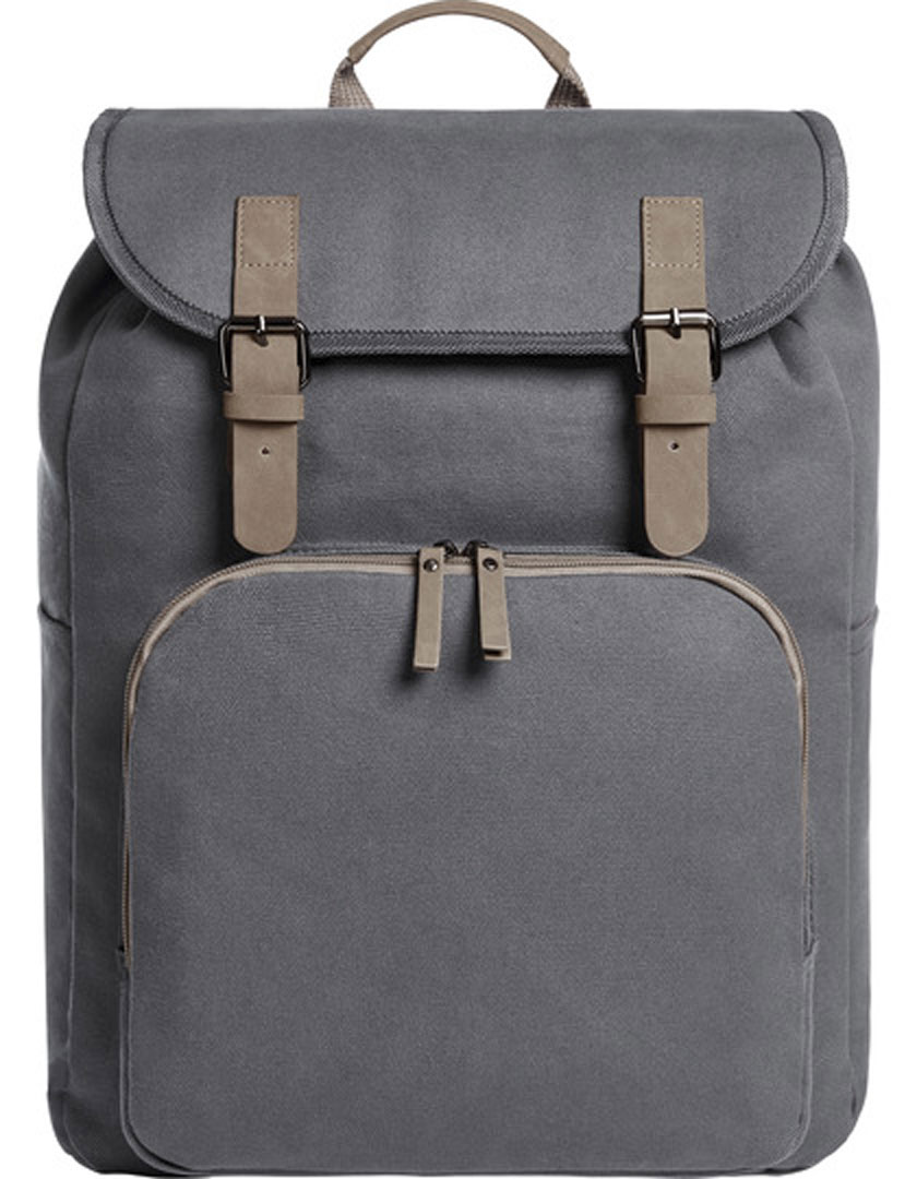 Überschlag mit verstellbaren Zierschnallen und Magnetverschluss, großes Hauptfach mit Kordelzugverschluss, gepolstertes Notebookfach, Vortasche mit 2-Wege-Reißverschluss, seitlich zwei flache Einsteckfächer, Handgriff mit Griffmanschette, gepolsterte und längenverstellbare Schultergurte, wertige Metall-Accessoires und PU-Velourskunstleder-Accessoires