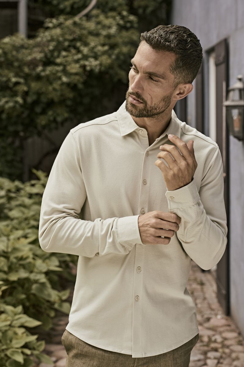 Leicht taillierter Schnitt, Polokragen aus gleichem Material, Manschetten mit Knöpfen, hergestellt aus langstapeliger Baumwolle, 40° waschbar, nicht trocknergeeignet