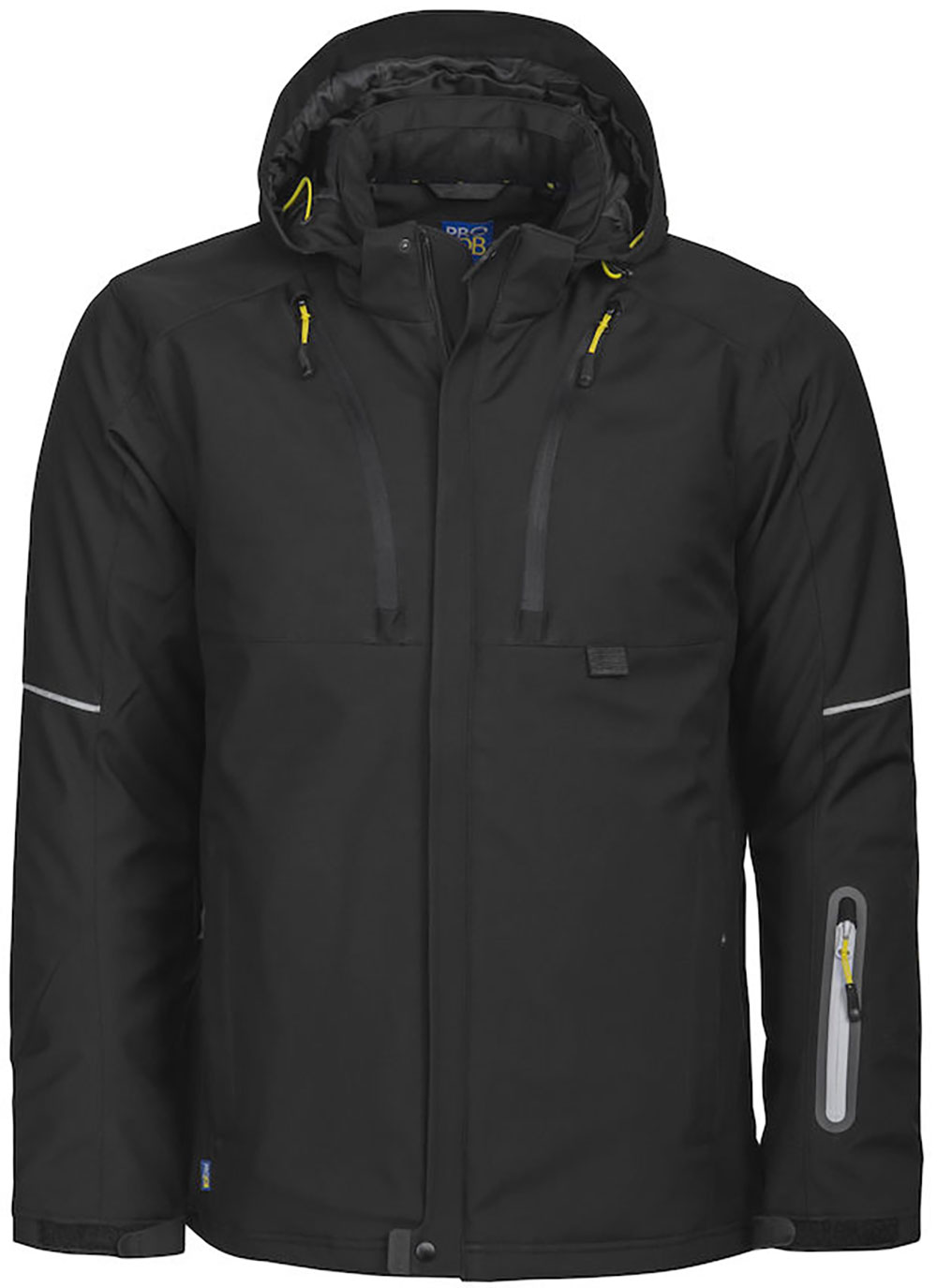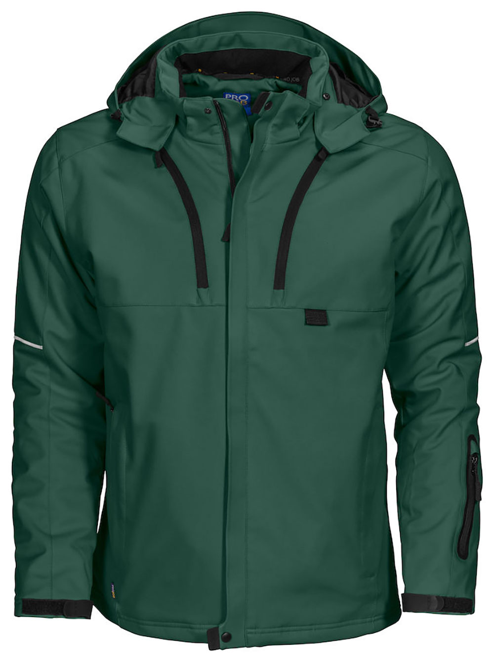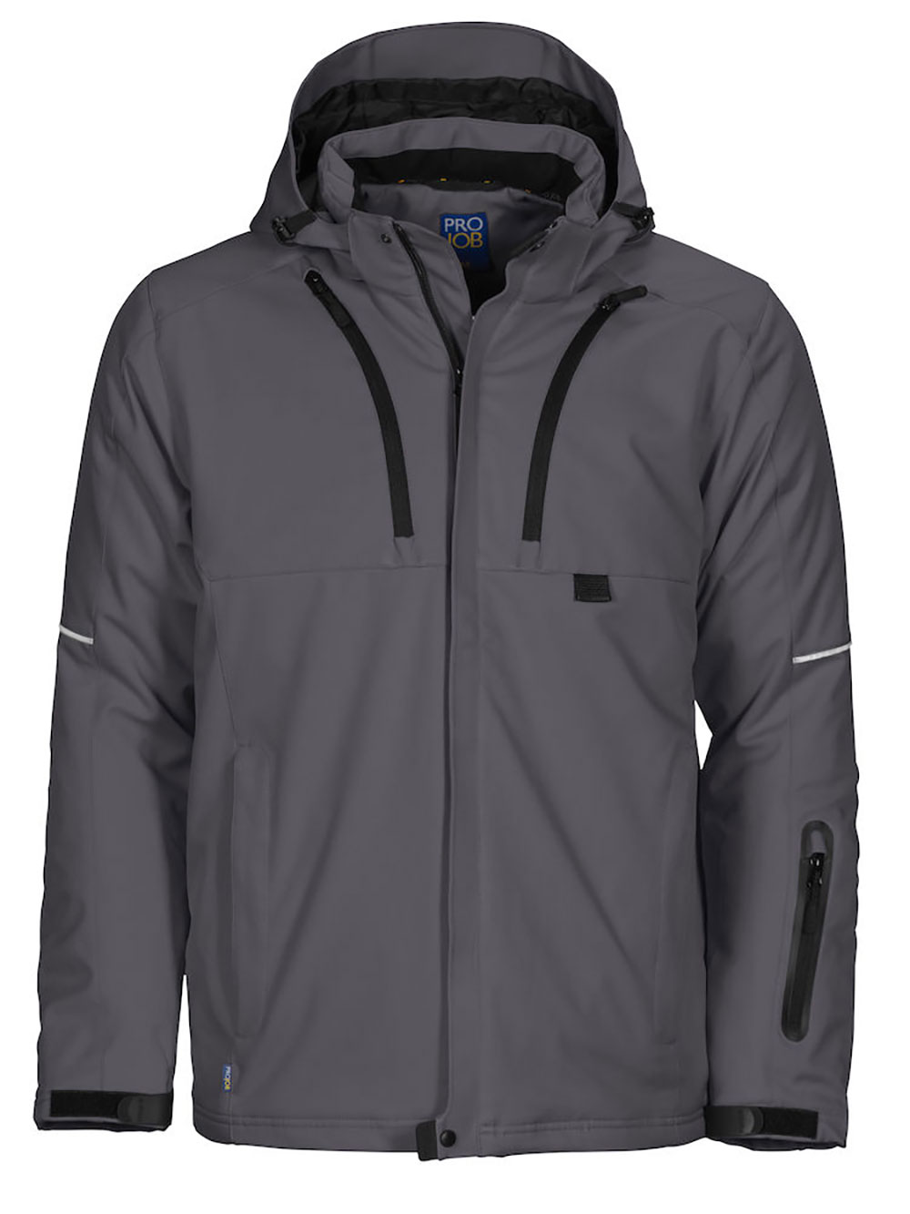 3-lagige, wind- und wasserabweisende Softshell-Jacke mit Steppfutter für kalte Arbeitstage. Zwei Brusttaschen, davon die linke mit Handy-Tasche. ID-Karten Halter. Zwei Innentaschen mit Reissverschluss, davon eine gross genug für Dokumente. Zwei Seitentaschen mit Reissverschluss und eine zusätzliche Tasche am Arm. Belüftungsreissverschlusse unter den Achseln. Kordelzug im Bund und verstellbare Ärmelbündchen. Verlängerter Rücken. Reflektorstreifen an den Ärmeln und am Rücken. Verstellbare und abnehmbare Kapuze. Fleece-Futter im Kragen und den Seitentaschen für mehr Komfort.