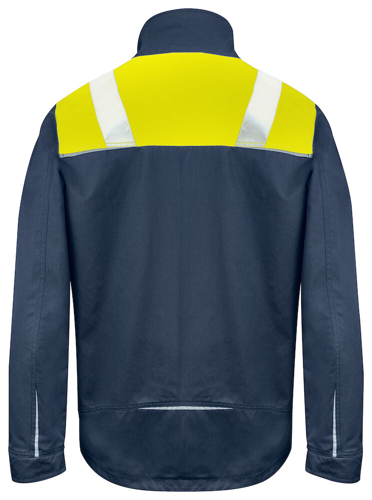 Brusttaschen auf beiden Seiten, innen links mit Vorrichtung für ID-Kartenhalter. Seitentaschen mit Reissverschluss. Geräumige Innentaschen, auch eine Handy-Tasche mit Klettverschluss. Verlängerter Rücken. Verstellbare Klettverschlussbündchen. Fluoreszierendes Material und Reflektoren im Schulterbereich sowie reflektierende Paspelierung im Rücken und an den Fronttaschen für bessere Sichtbarkeit.