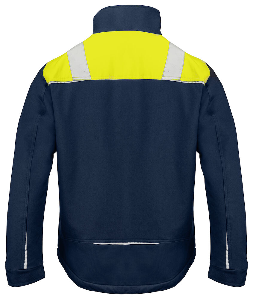 Brusttaschen auf beiden Seiten, innen links mit Vorrichtung für ID-Kartenhalter. Seitentaschen mit Reissverschluss. Geräumige Innentaschen, auch eine Handy-Tasche mit Klettverschluss. Verlängerter Rücken. Verstellbare Klettverschlussbündchen. Fluoreszierendes Material und Reflektoren im Schulterbereich sowie reflektierende Paspelierung im Rücken und an den Fronttaschen für bessere Sichtbarkeit. Das Futter kann für ein einfaches Bedrucken und Besticken geöffnet werden.