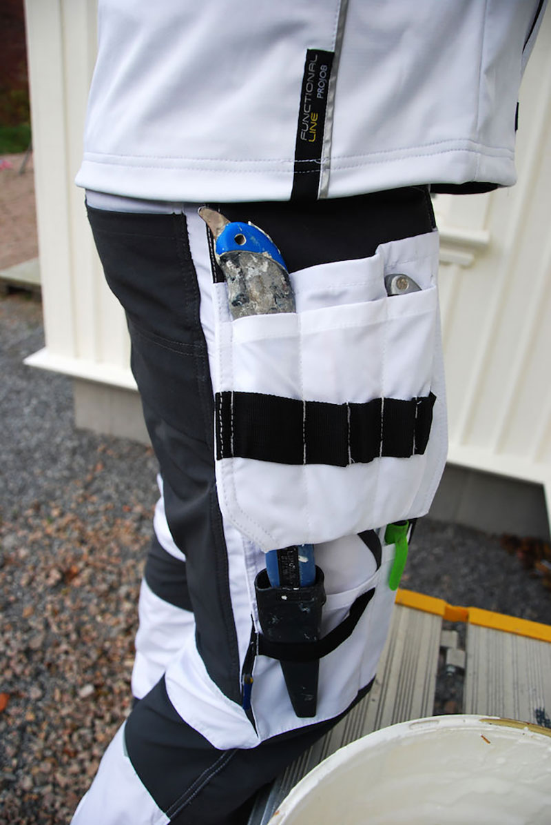 Modern geschnittene Bundhose mit Stretchmaterial am Gesäss, Schritt und Kniekehle. Wiederstandsfähiger Stretch CORDURA im Kniebereich. Belüftungsöffnungen entlang des Beines. Vorgeformte Knie. Knieprotektortaschen mit Öffnungen auf der Innenseite des Hosenbeins mit 2-facher Verstellmöglichkeit. Zwei Beintaschen: die Rechte mit Metertasche und die Linke für Werkzeug. Zwei Gesässtaschen. 2 abnehmbare Hängetaschen. DWR-C6 beschichtet, so dass das Material wasser-, staub- und schmutzabweisend ist.