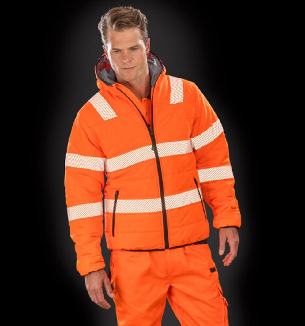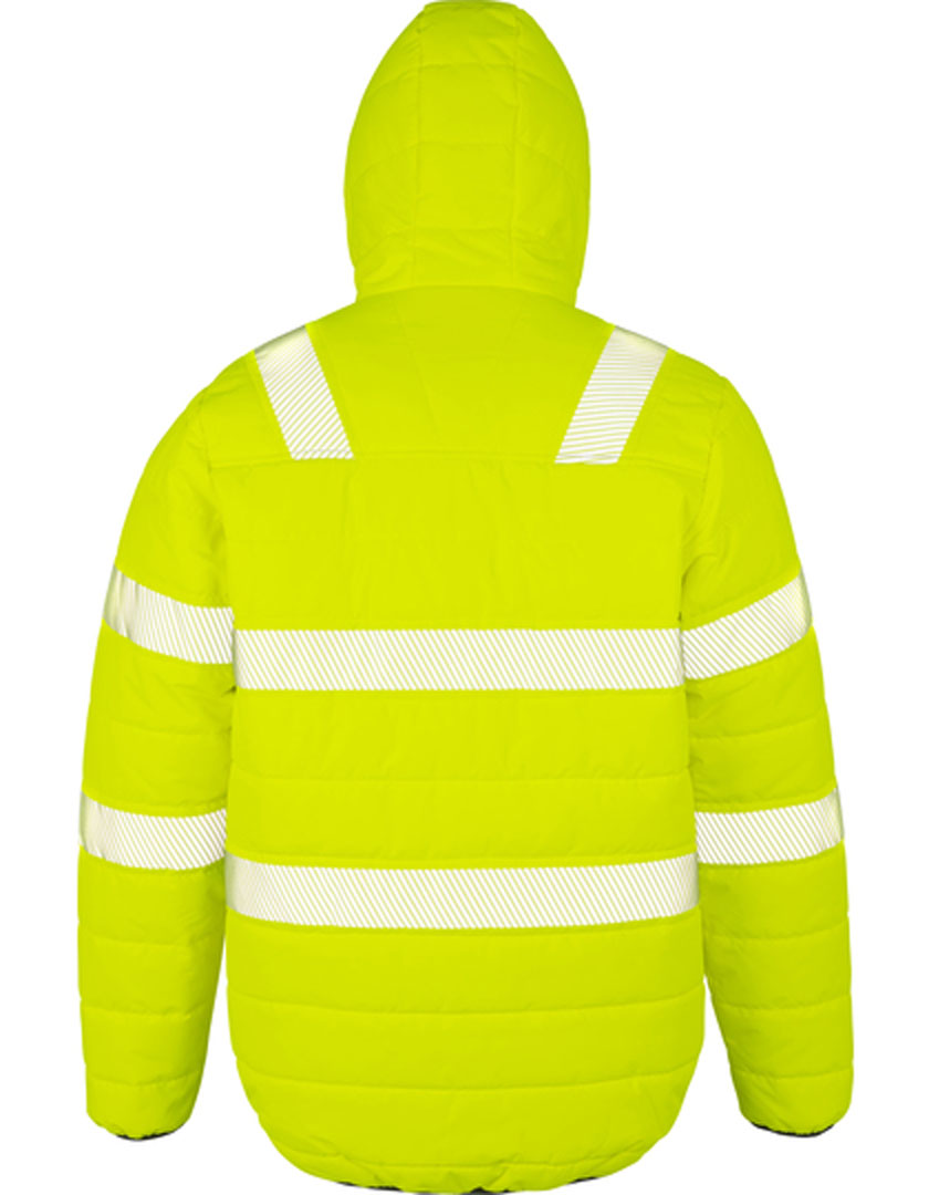 Wattierte, bedruckbare Sicherheitsjacke mit Kapuze und wasserabweisender Beschichtung.