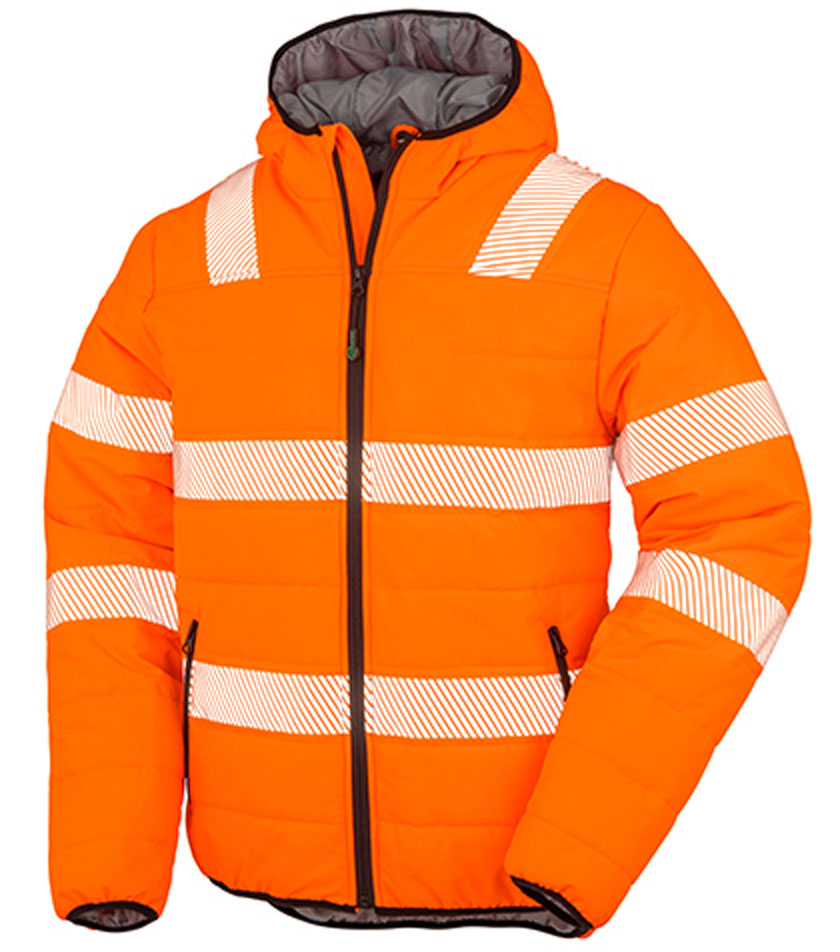 100% recyceltes REPREVE®-Polyester mit warm gebürstetem Innenfleece, Ripp: 100% Polyester, atmungsaktiv, windabweisend, EN ISO 20471: 2013 + A1:2016 Klasse 2, RIS-3279-TOM Klasse 2 (nur Orange), stark elastischer und gerippter Ärmelabschluss/Taillenbund, bedruckte Sicherheitsbände leicht dehnbar, durchgehender YKK-Reißverschluss vorn und Griff, Vorder- und Brusttaschen mit Reißverschluss, Kapuze mit Zugband, Aufhänger, Recyceltes, hochwertiges REPREVE®-Gewebe aus umweltfreundlichen Materialien aus Flaschen aus recyceltem Kunststoff und postindustriellem Abfall, Recyclingfähig am Ende der Lebensdauer, Hersteller gewährleistet die Reflektionseigenschaft gemäß EN-Norm für 25 Waschgänge bis 40 °C