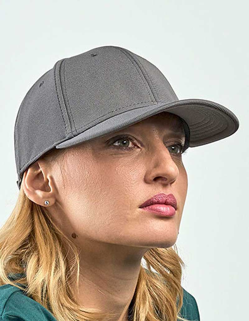 6-Panel-Cap, recycelter Polyester, mittleres Visier, genähte Ösen, sechs Ziernähte auf dem Schirm, dehnbares Elasthan-Material sorgt für eine universelle Passform, Klettverschluss