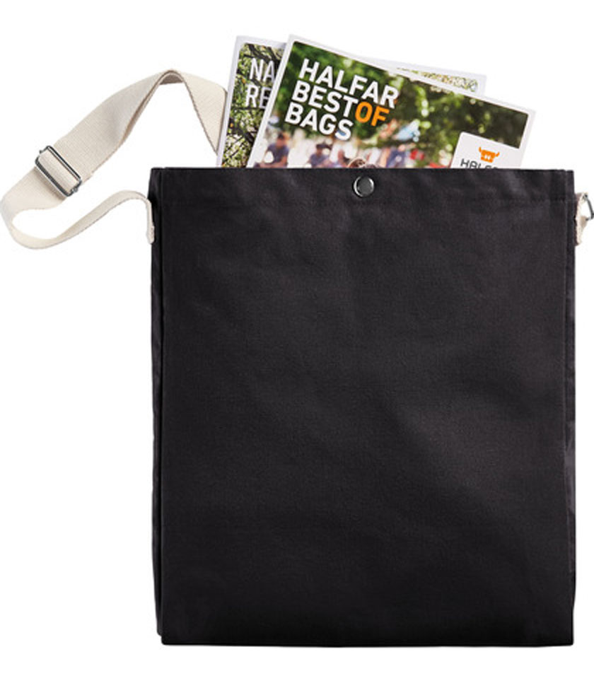 Geräumiges Hauptfach - ideal geeignet für Kataloge und DIN A4 Unterlagen, mit Druckknopf verschließbar, breiter und längenverstellbarer Baumwoll-Schultergurt, Lieferung ohne Inhalt/Deko
