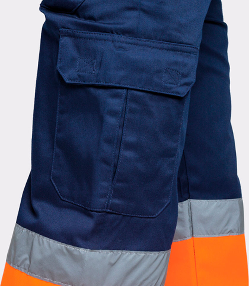 Multitaschen-Hose Hi-Viz für den Winter, Bund mit elastischem Einsatz am Rücken, zwei Gesäßtaschen mit Patte und Klettverschluss, zwei Fronttaschen und zwei Seitentaschen mit Patte und Klettverschluss, zweifarbig mit Reflexband, Zertifiziert nach CE-Normen: EN ISO 13688:2013 und UNE-EN ISO 20471:2013/A1:2016, Klasse I