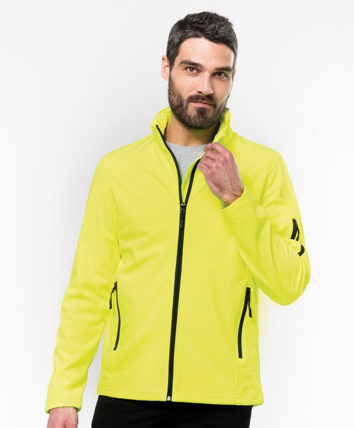 Herren 3-Lagen Softshell Jacke in Leuchtfarben Material: Außen: 300g/m², 95% Polyester, 5% Elasthan, Mittelschicht: atmungsaktives Material, Innen: Microfleece 3-lagiges Material, wasserdicht (8.000mm Wassersäule), atmungsaktiv (3.000g/m² in 24h), durchgehender Qualitäts-Reissverschluss, 1 Ärmeltasche mit Reissverschluss links, 2 Vordertaschen mit Reissverschluss, 40° waschbar, nicht trocknergeeignet Grössen: S – 4XL
