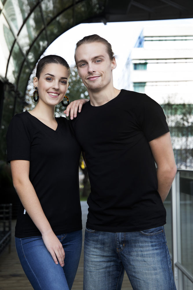 Modernes Stretch T-Shirt für Damen mit V-Neck.  Hergestellt aus hochwertiger Baumwolle und mit Elastan Anteil für besten Komfort und Passform. 96% ökologisch angebaute Baumwolle Fairtrade, 4% Elasthan, 180 g/m2