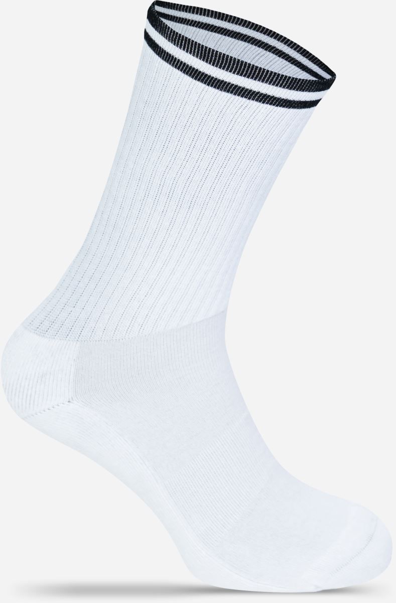 Atmungsaktives Material, Fussbereich aus Bio-Baumwolle, gerippter Schaft aus recyceltem Polyester, Polyamid und Elasthan, Streifen in Kontrastfarbe, ideal für Sublimation, hergestellt in Europa, Kartoneinleger in jeder Socke für leichtes Bedrucken, 30° waschbar, trocknergeeignet, nicht bügeln