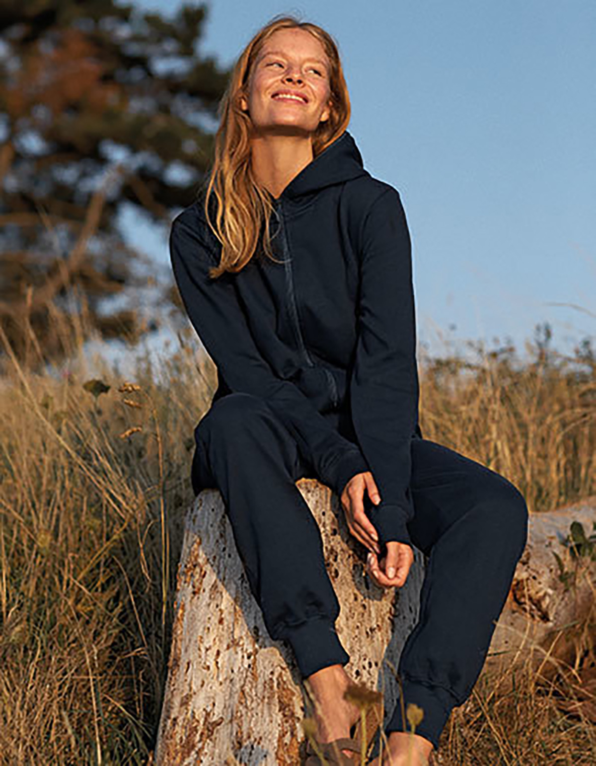 100% Fairtrade-Baumwolle, Gekämmte Bio-Baumwolle, Fleece mit gebürsteter Rückseite, Passender YKK-Reißverschluss, Doppelt gefütterte Kapuze, Elasthan-Rippung an den Ärmeln und am Saum, Flache Schnüre