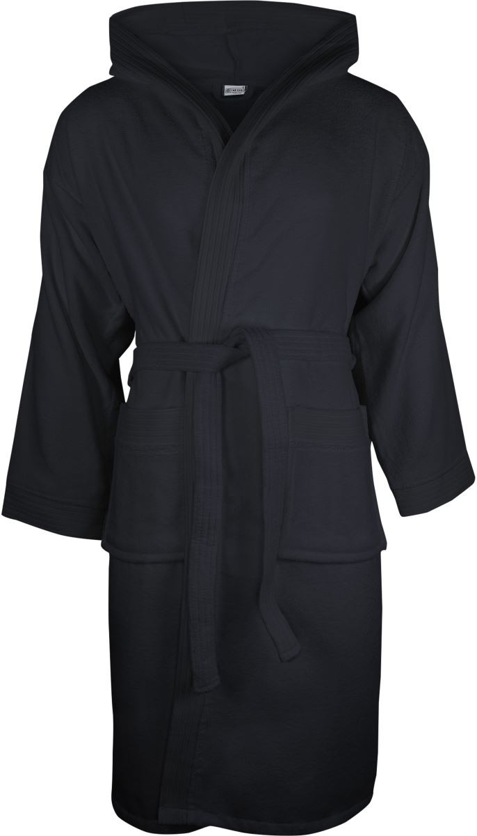 Aussenseite aus weichem Velours, Innenseite aus saugfähigem Frottee, Bordüren an Kragen Ärmel und Taschen, 60° waschbar, Aufhängeöse