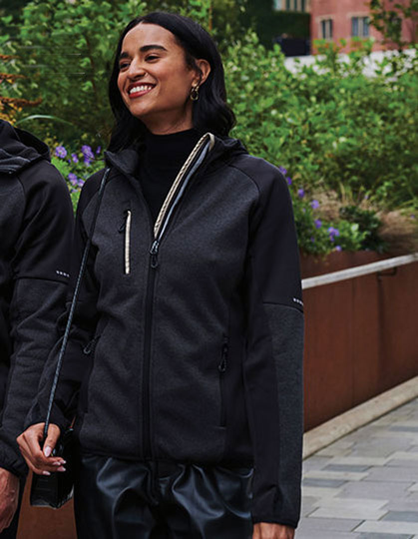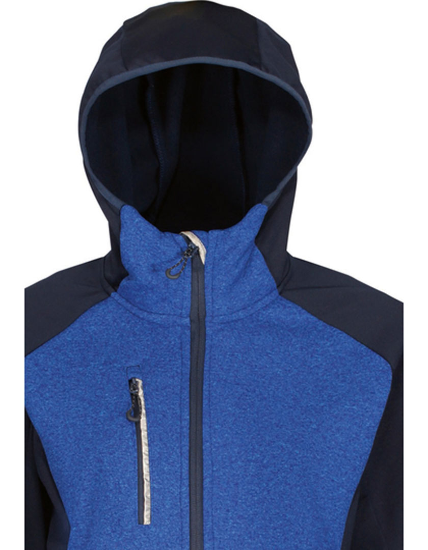 Warmes meliertes Strick-Vlies mit Extol-Stretch-Seiten, Kapuze und Einsätzen im Achselbereich, RFID-Schutz an der Brusttasche für zusätzliche Sicherheit, angedeutete Kapuze und Stretch-Bindung an Kapuzenöffnung, Saum und Ärmelabschlüssen mit Daumenloch, zwei tief angesetzte Reißverschluss-Taschen und eine Reißverschluss-Brusttasche, Kinnschutz, reflektierende Details, 40 °C waschbar