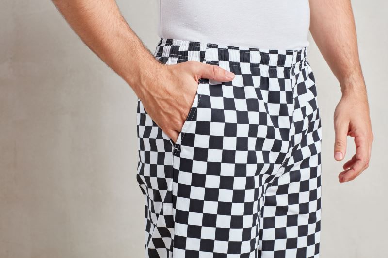 Pantalon unisexe à enfiler pour les cuisiniers, Taille élastique afin de permettre un enfilage facile du pantalon, Taille unisexe, Disponible avec une longueur de 30.5'/ 77 cm, Poches latérales au style Swing-Pocket, Tunnel de serrage, Le matériel certifié selon l'Oeko-Tex® Standard 100, WRAP Certification