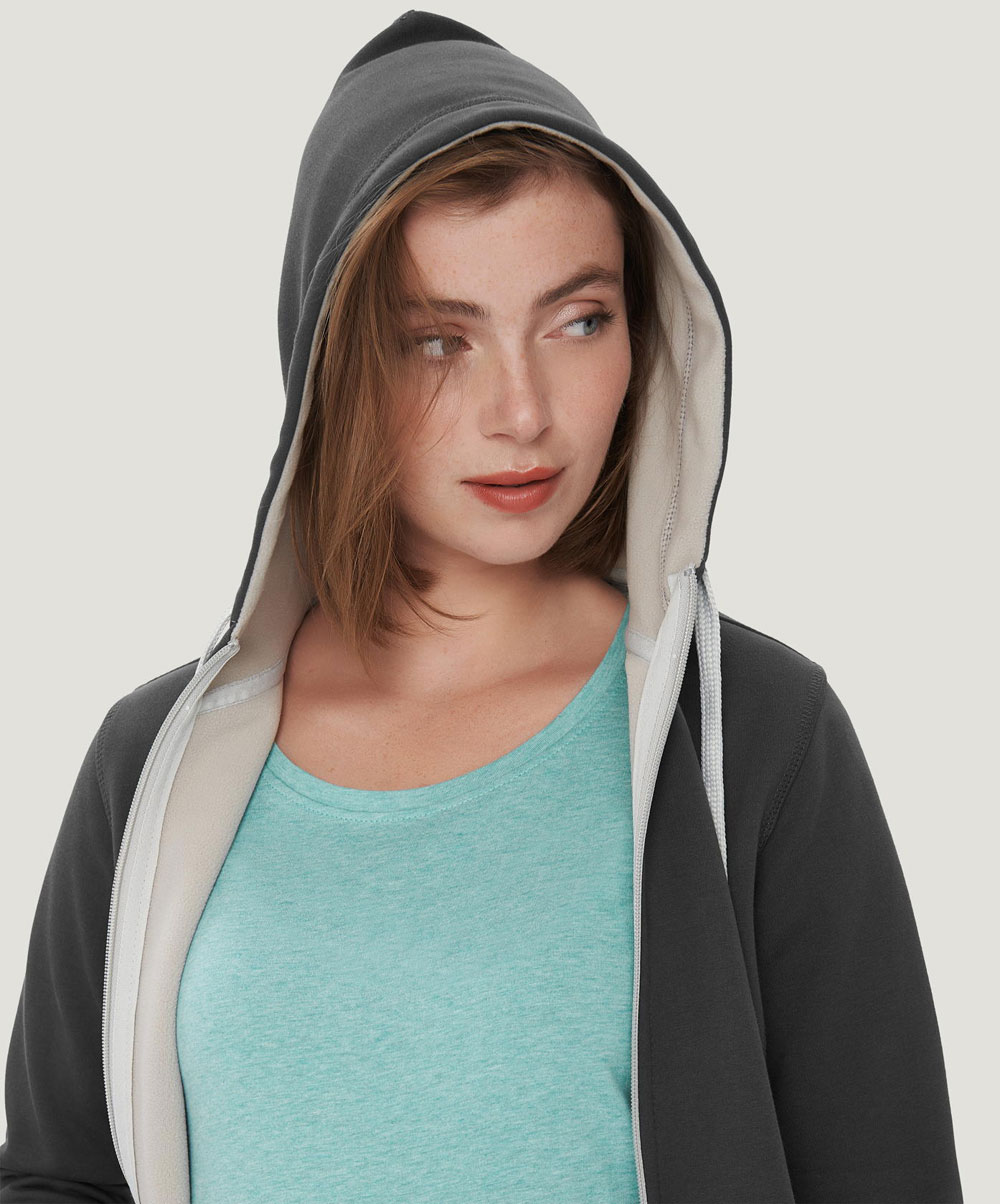 Veste à capuche de finition impeccable pour femme, avec intérieur micropolaire doux contrasté, fermeture éclair contrastée de grande qualité sur le devant, capuche haute avec cordon contrasté et oillets métalliques de grande qualité. Toutes les fermetures éclair et les oillets sont de la marque YKK. Bord-côte indéformable contenant du LYCRA, poches avec fermetures éclair, coutures de séparation parfaitement ajustées avec surpiqure flatlock décorative, revers d'encolure contrasté et bande de propreté. Fabriquée à partir d'une matière laminée 2 couches, avec extérieur en jersey simple fin à base de coton peigné ringspun à longues fibres, et intérieur en micropolaire douce.