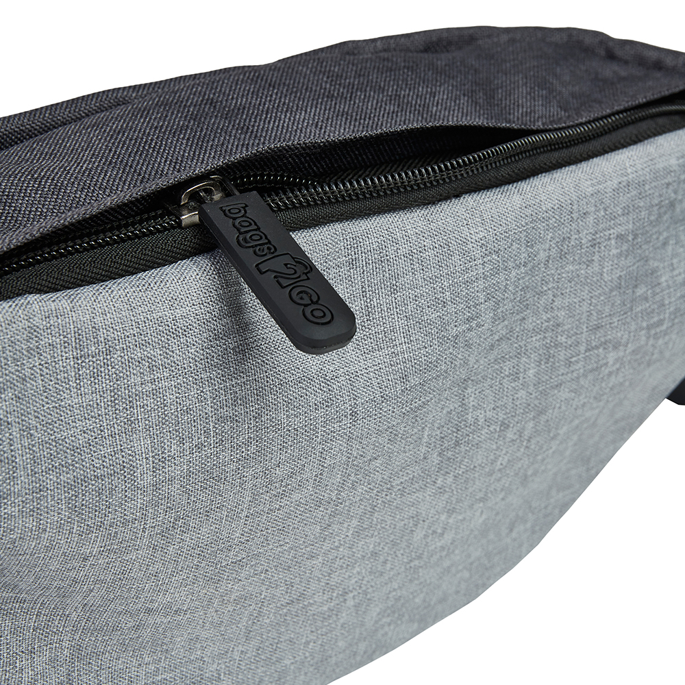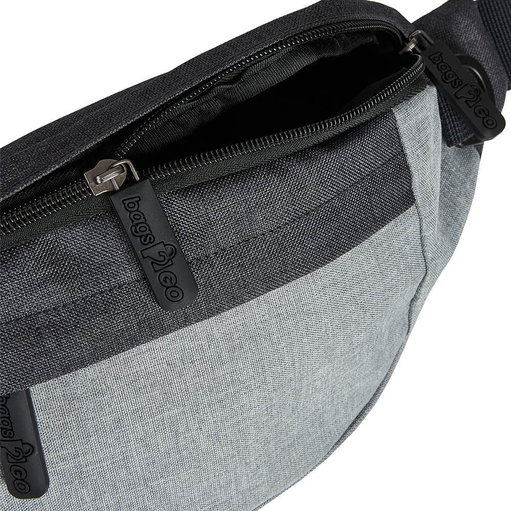 Sac bandoulière en polyester 600D gris foncé et gris clair, Compartiment principal zippé à double sens, Petite poche frontale attachée avec fermeture éclair dissimulée, Anneau en D en plastique sur le côté, Poche longue supplémentaire zippée au dos, Sangle de transport ajustable gris foncé avec fermeture à clic, Toutes les fermetures éclair sont noires, les tirettes de fermeture éclair en caoutchouc portent l'inscription « bags2GO » en relief, Capacité : environ 4 litres