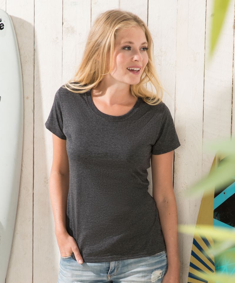 Col rond en coton/Lycra®, Bande de propreté de la même couleur, Coupe féminine cintrée avec des coutures latérales, Densité élevée des mailles pour une meilleure imprimabilité
