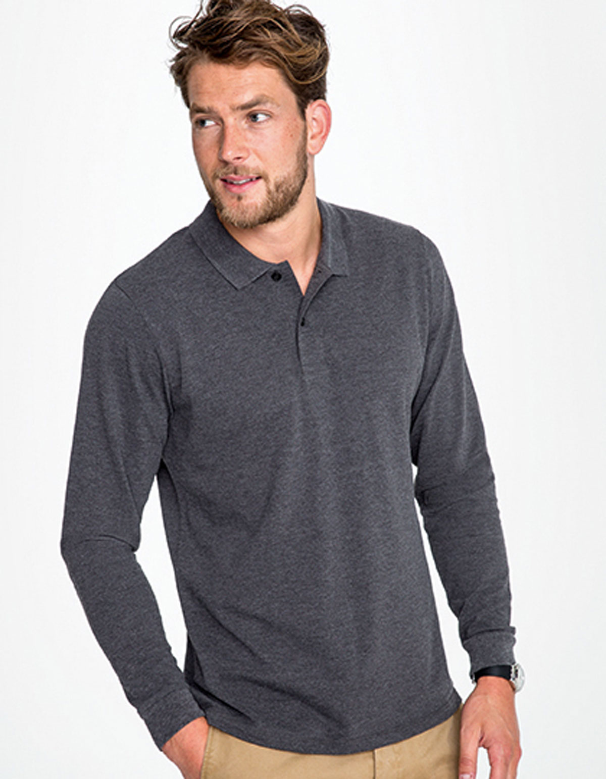 Composition: 180g/m², 100% Coton (Charcoal Melange: 60%Coton, Polyester / Grey Melange: 85% Coton, 15% Viscose / Ash: 98% Coton, 2% Viscose) Manches longues, Patte de boutonnage 3 boutons, Coupe ajustée, Bande de propreté intérieure col Tailles: S, M, L, XL, XXL
