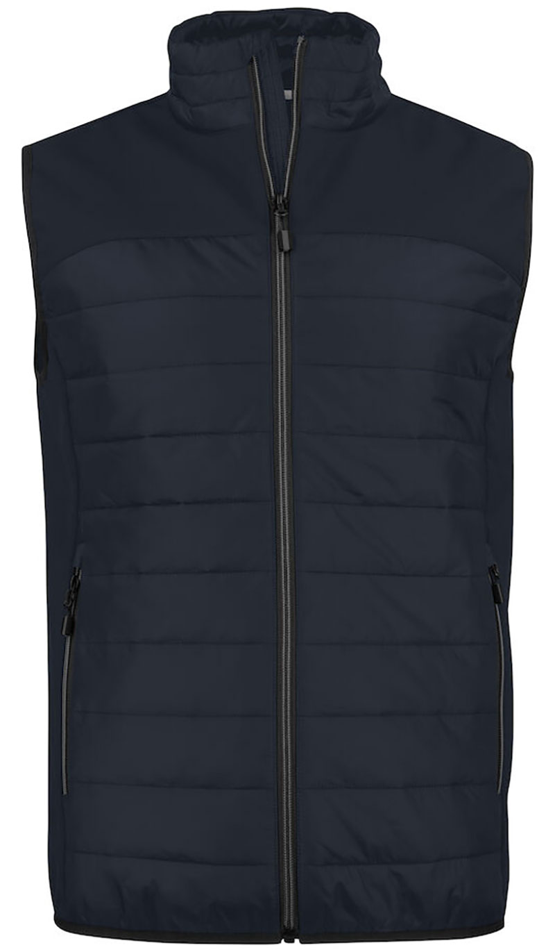 Softshell bodywarmer ultra-légère Epaules et parties latérales en softshell (tissu 1). Dos et face avant en doudoune légère (tissu 2). Fermeture de couleur contrastée devant et aux poches. Tire-zips bicolores. Bords élastiqués aux manches et au bas de la veste. Protège-menton. menton // Tissu 1) Softshell ; 94% polyester, 6% élasthanne. Tissu 2) 100% polyester avec rembourrage en fibre écologique d’origine renouvelable "Bluesign" (100 g/m2)