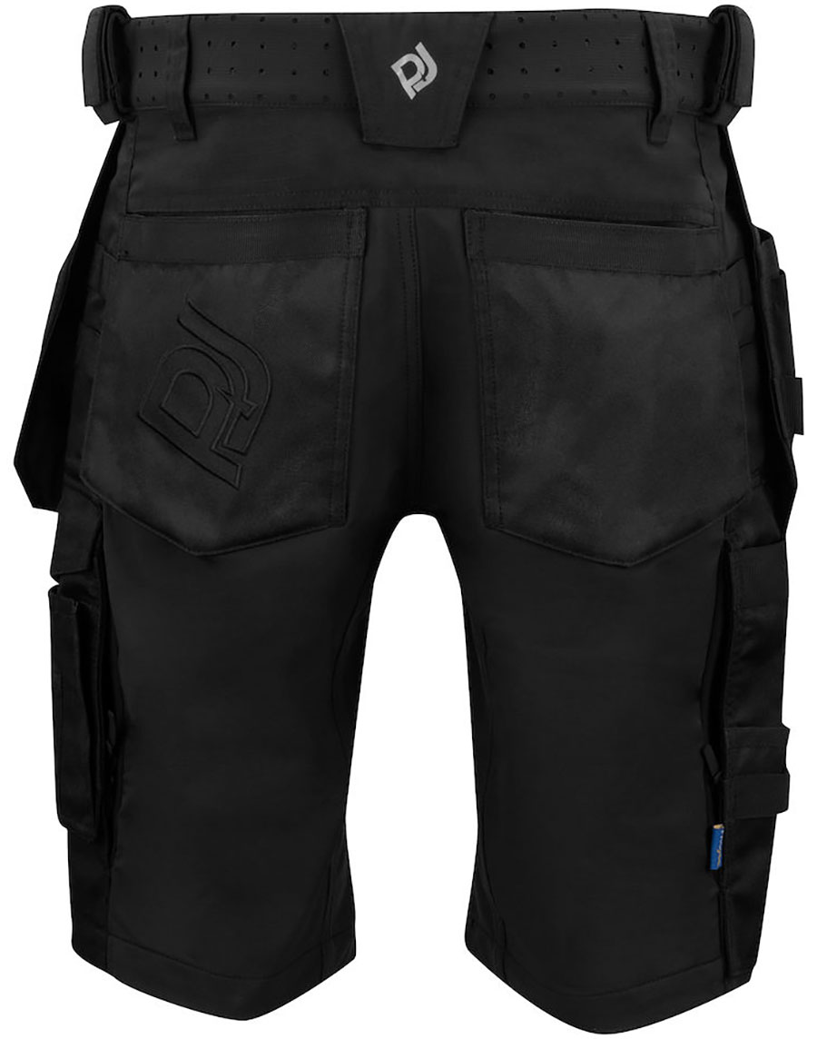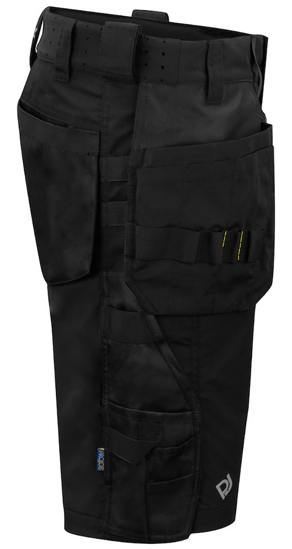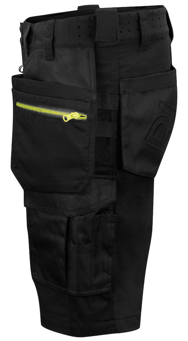 Short stretch de coupe moderne pour une liberté de mouvement optimale. Elasticité dans 4 directions au niveau des fessiers et des cuisses. Ouvertures d'aération sur les côtés avec fermeture éclair et doublure en mesh, également à la taille. Sur la jambe gauche, une poche cargo avec espace pour divers outils et stylos, avec anneau en D; une poche pour mètre pliant sur la jambe droite avec espace pour divers outils et smartphone.