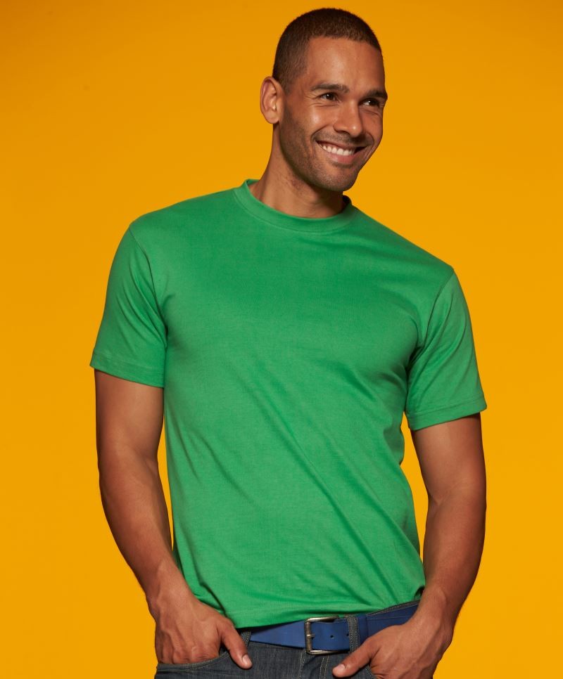 Coton ring-spun peigné, T-shirt confort en jersey simple résistant, Encolure ronde avec de l'élasthanne, Bande de renfort d'épaule à épaule, Pas de coutures latérales, Doubles coutures aux épaules, encolure et emmanchures