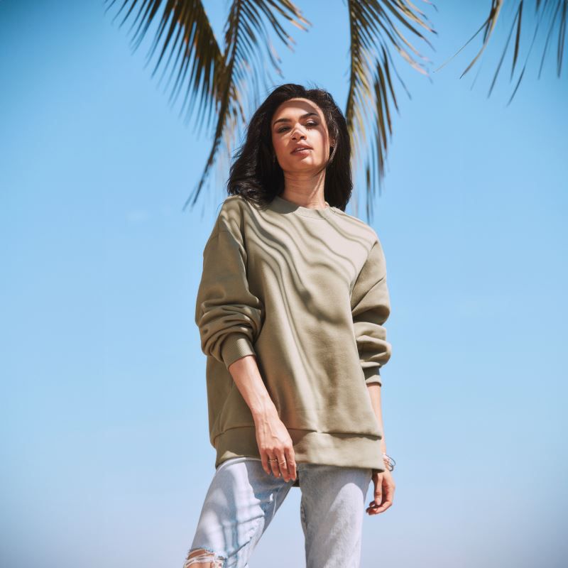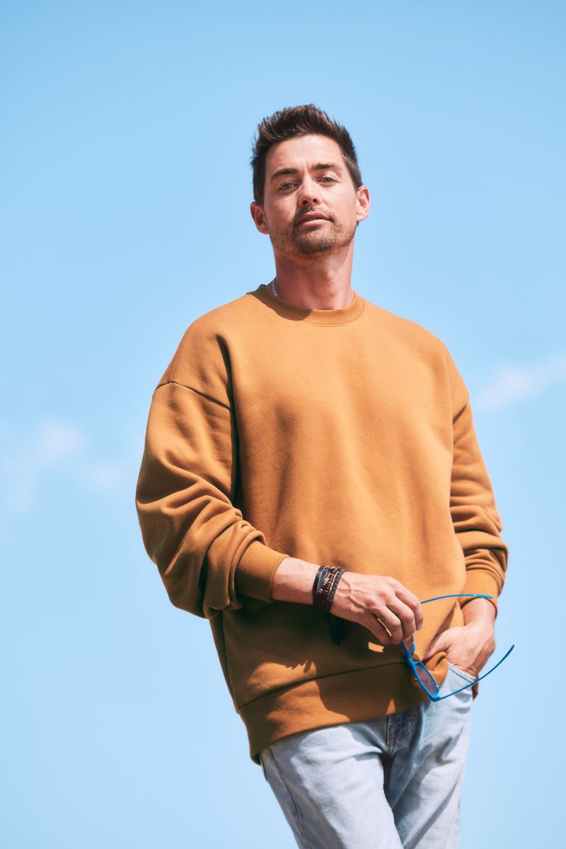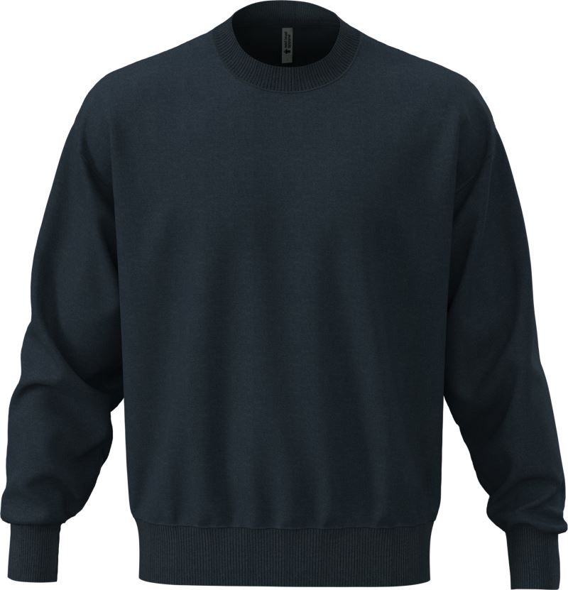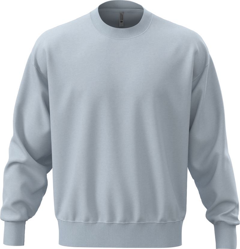 Coupe oversize, demi-lune dans le cou, bandeau dans le cou, épaules recoupées, 2x2 bords-côtes au cou, aux manches et à l'ourlet, qualité sweat 3 fils, surface 100% coton, intérieur gratté, étiquette TearAway