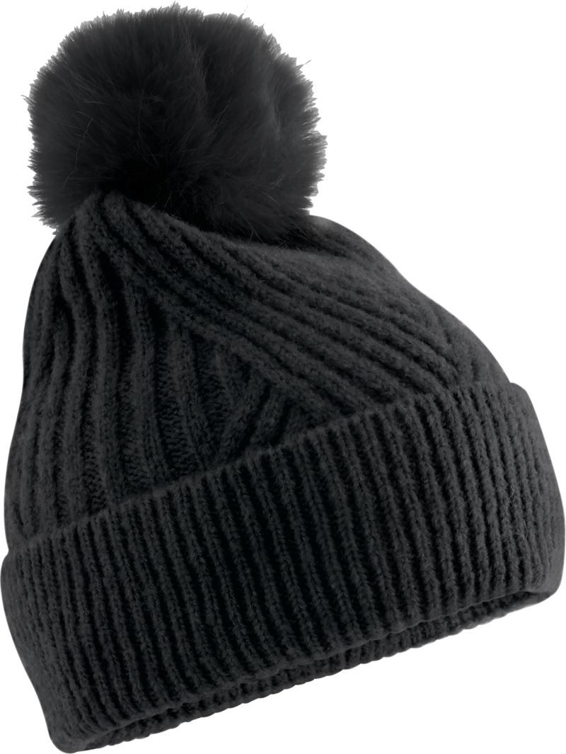 Revers, pompon ton sur ton, grosses côtes, pompon en fourrure synthétique, toucher doux, étiquette TearAway, lavage à la main, ne passe pas au sèche-linge, ne passe pas au nettoyage à sec.
