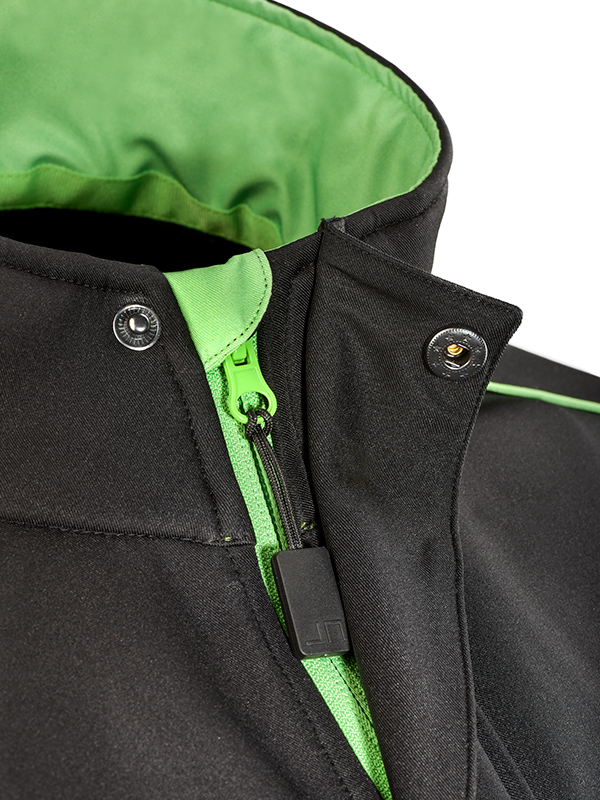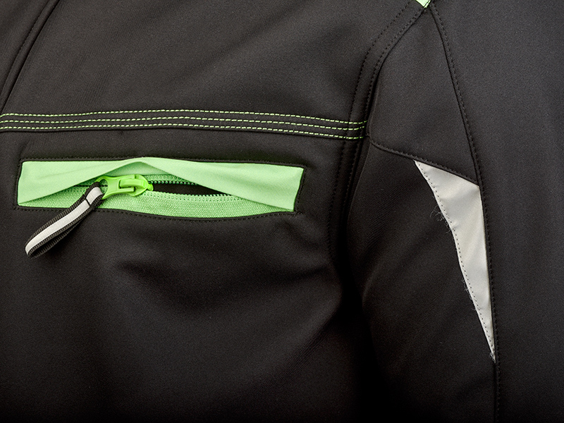 Softshell durable et robuste, Coupe-vent et imperméable (colonne d'eau 2,000 mm), Respirant et perméable à la vapeur d'eau (2,000 g / m² / 24 h), Col montant, Manches ergonomiques, Partie rallongée dans le dos, Poignets intérieurs, Fermeture éclair sur la longueur avec rabat coupe-vent et protège-menton, Poches latérales zippées, Poche poitrine avec rabat velcro et poche poitrine zippée, Poche intérieure pour téléphone portable, Eléments réfléchissants sur les manches et à l'arrière, Boutons et fermetures à glissière cachés